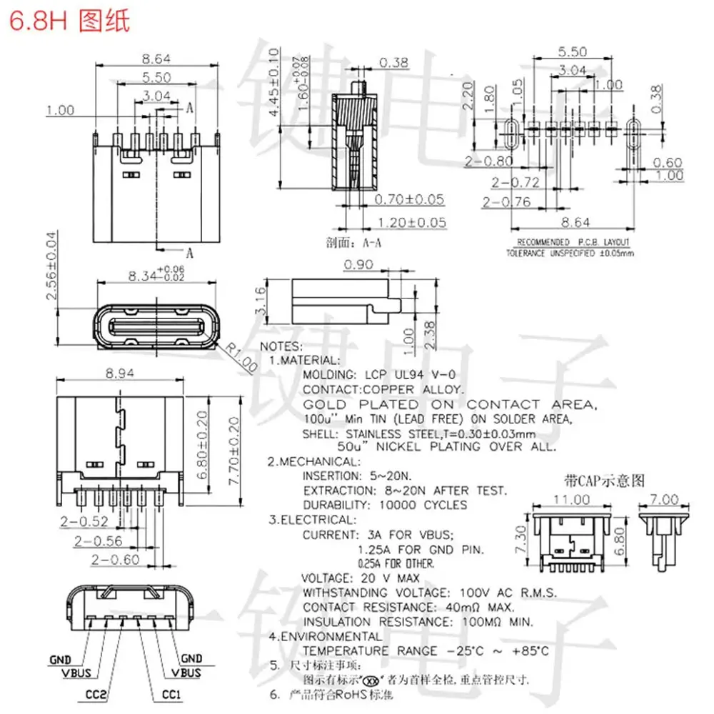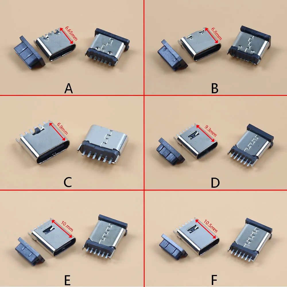 10 Uds. Asiento hembra TYPE-C 6P recto en altura vertical de 180 grados H=6,65 mm/6,8 mm/6,9 mm/9,3/10,0 mm/10,5 mm asiento femenino de carga rápida