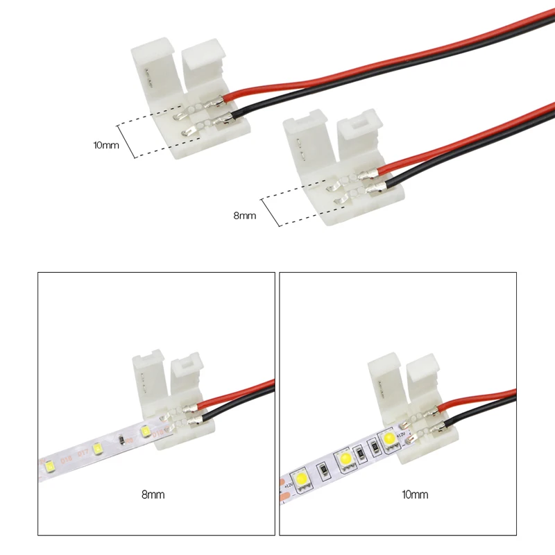 Comprar 10 Uds. Conectores de luz de tira Led de 2 pines sin soldadura conector de cable de alimentación de 8mm/10mm para cinta PCB de cable de tira Led 2835/5050
