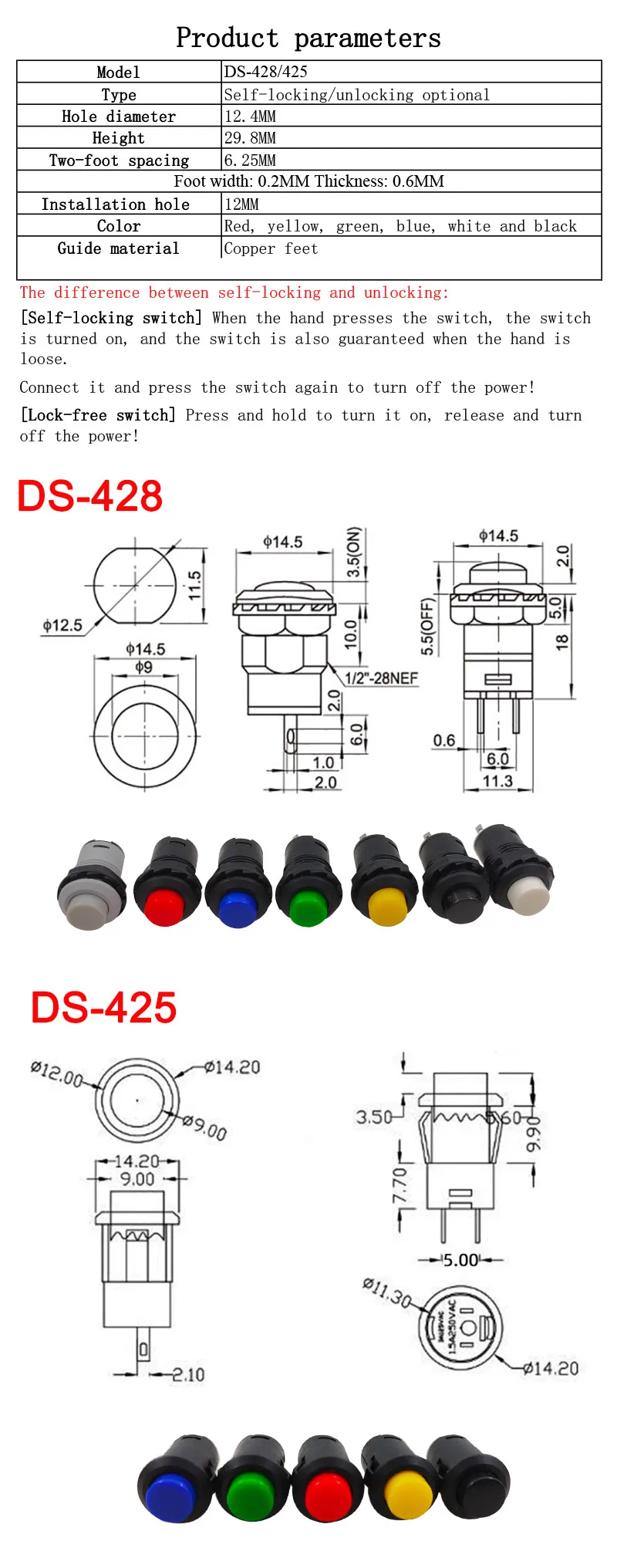 Comprar 10 Uds DS-428/427 interruptor de botón Circular desbloqueo interruptor de bloqueo automático tipo rosca apertura 12mm varios coloresDS-425