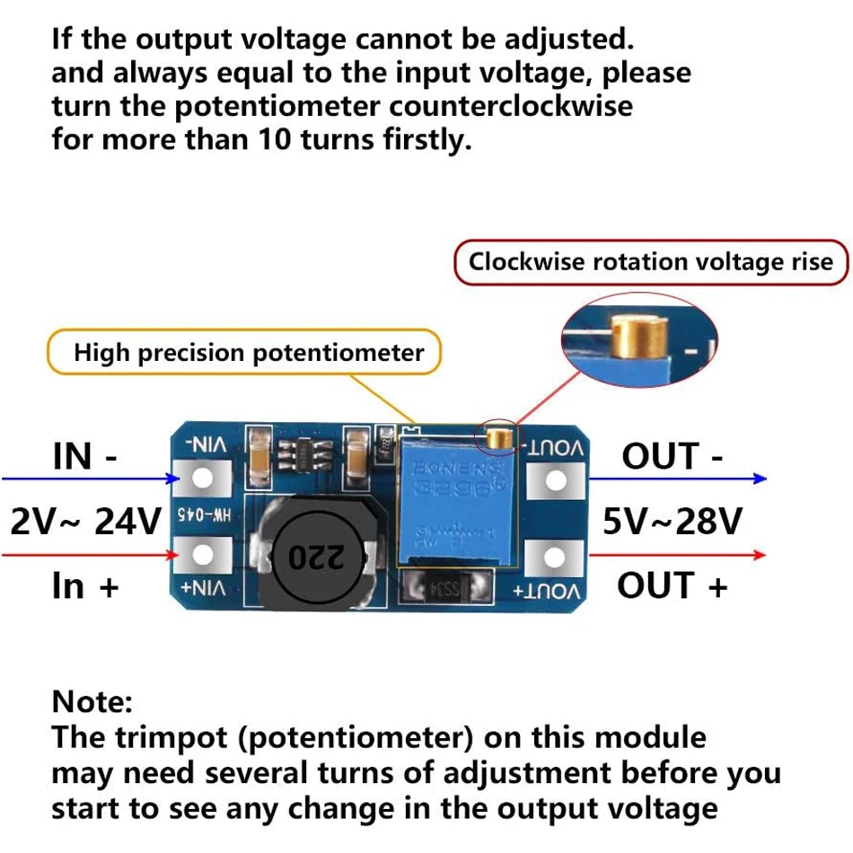 • Regulador de voltaje ajustable:El módulo ascendente ajustable MT3608 es una herramienta versátil que se puede ajustar para proporcionar una amplia gama de voltajes de 2V-24V a 5V-28V, haciéndola ideal para diversas aplicaciones.
