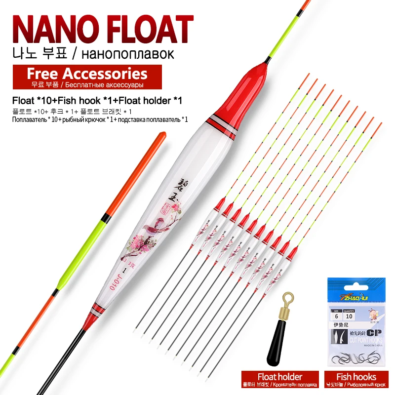 Comprar 10 Uds Nano flotadores de pesca + 1 ganchos de bolsa + 1 flotador de apoyo boya de agua dulce Bobber Lake River herramientas Boya estables accesorios aparejos