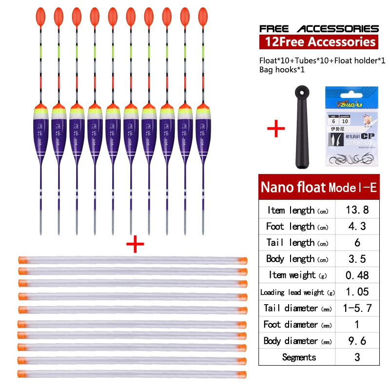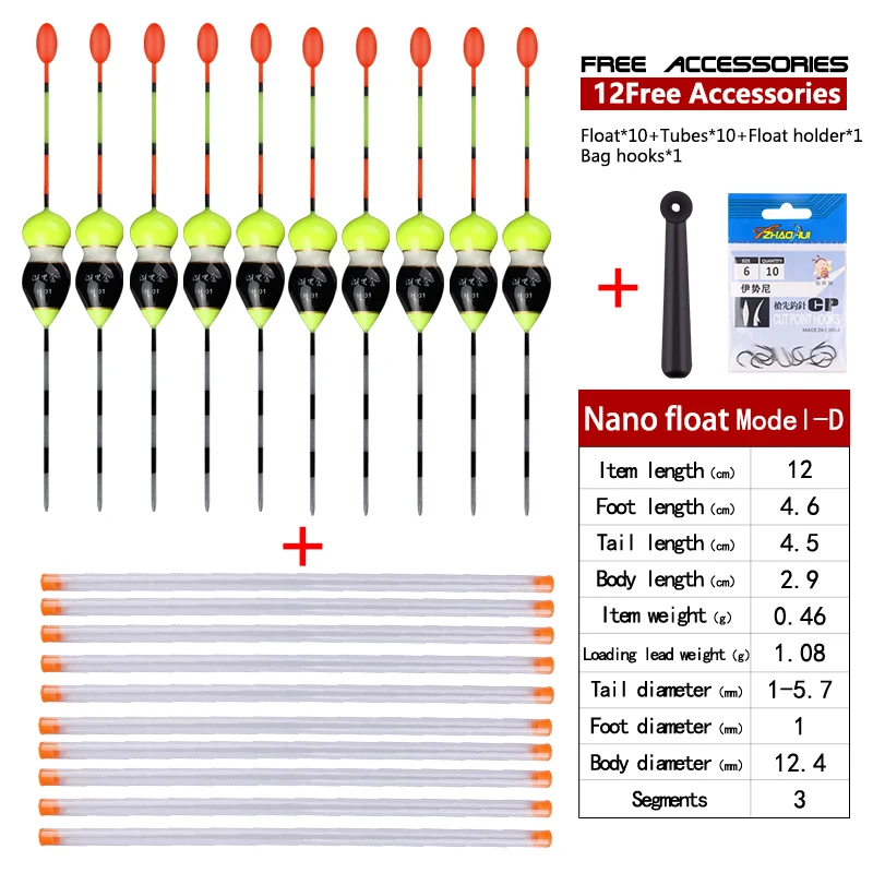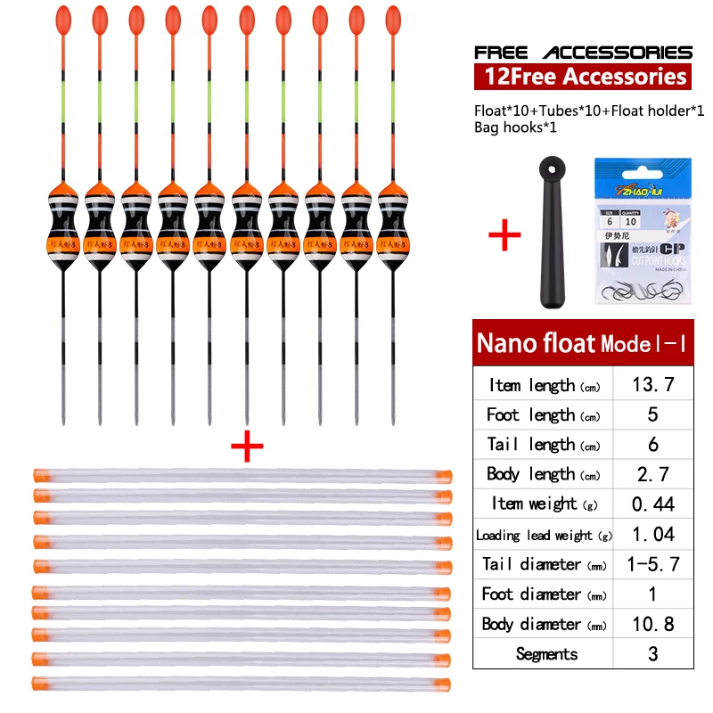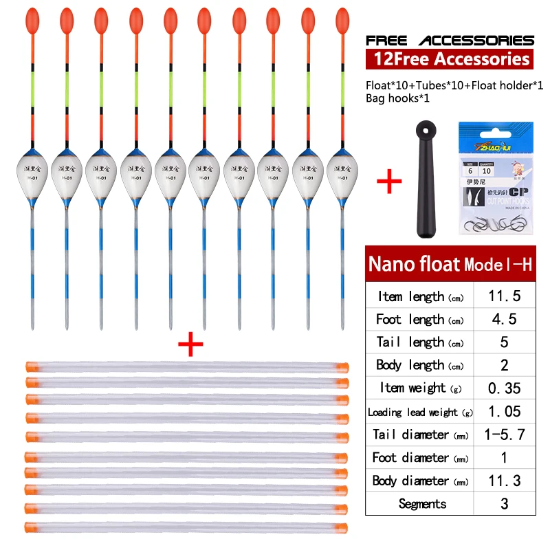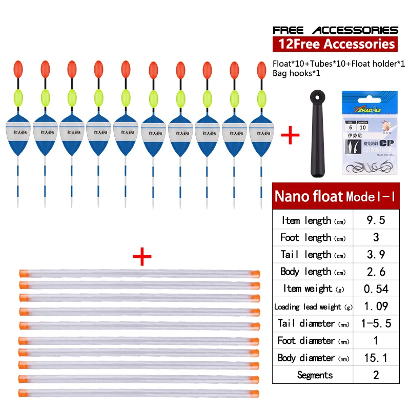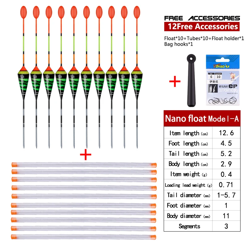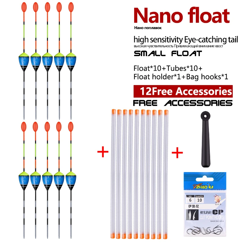 10PCS Nano Fishing Floats+10 Buoy Tubes+1 Bag Hooks+1 Buoy Holder Durable Bobber with Beads Tail Buoy Short Length Floats Tools