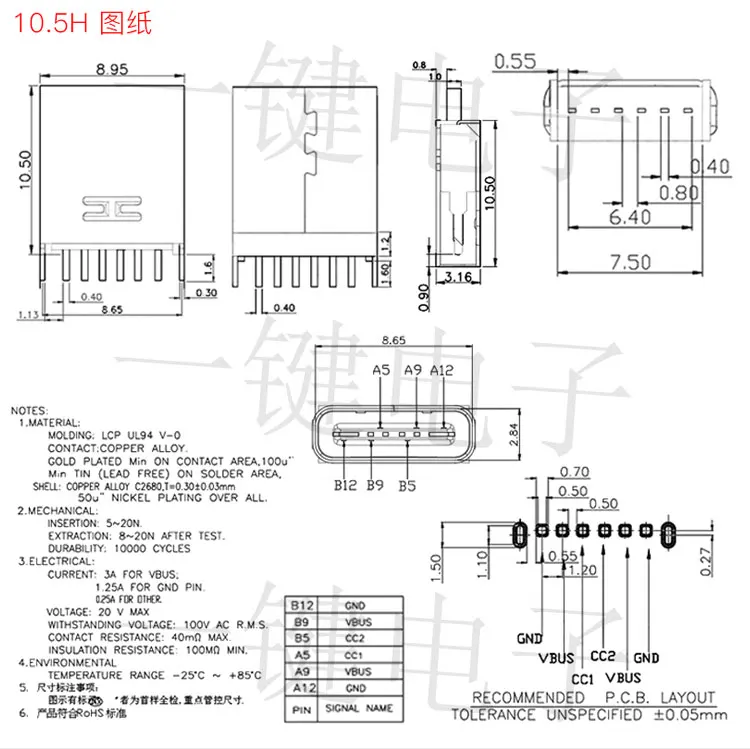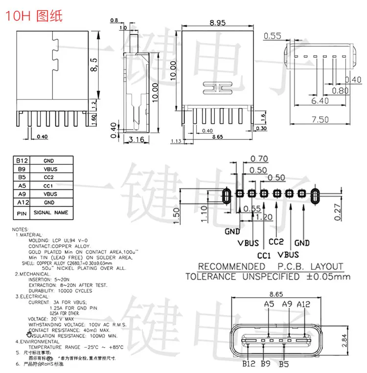 10 Uds TYPE-C 6P interfaz hembra enchufe vertical 10,0 MM enchufe recto carga rápida hembra 3.1 conector USB