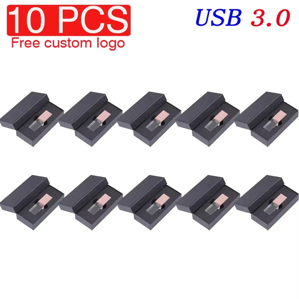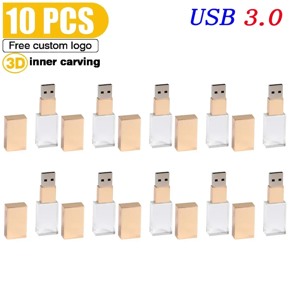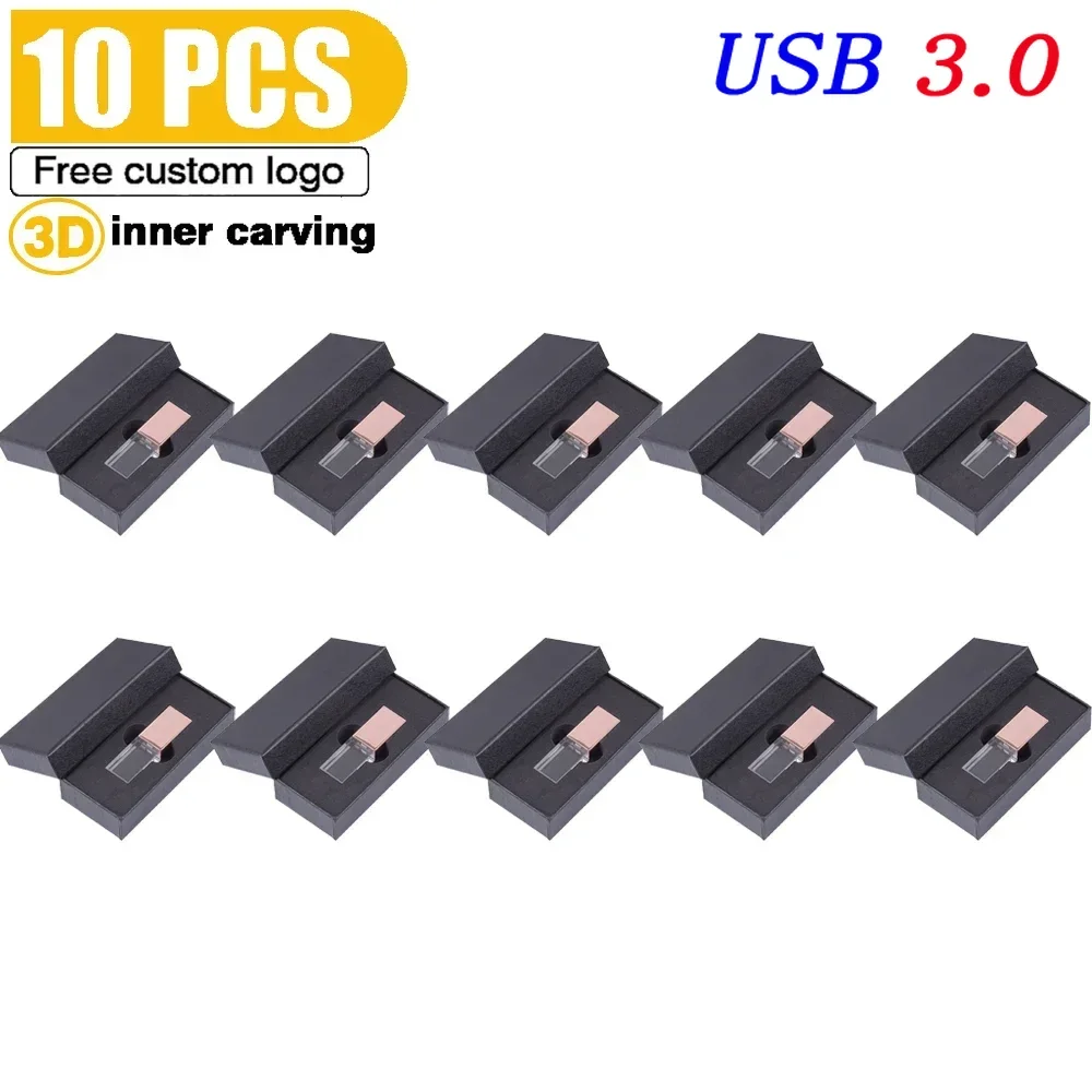 Comprar 10 unids/lote nuevo cristal de alta velocidad USB 3,0 unidad Flash regalo de boda 128GB gratis 3D grabado Memory Stick 64GB caja negra Pen Drive