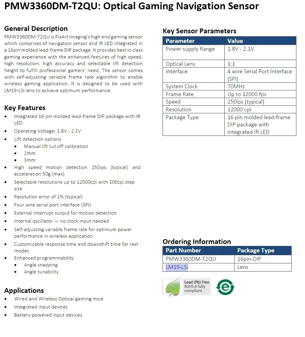 10 unids/lote nuevo Original PMW3360DM-T2QU Sensor DIP-16 PMW3360 PMW3360DM ratón óptico Chip de navegación para juegos