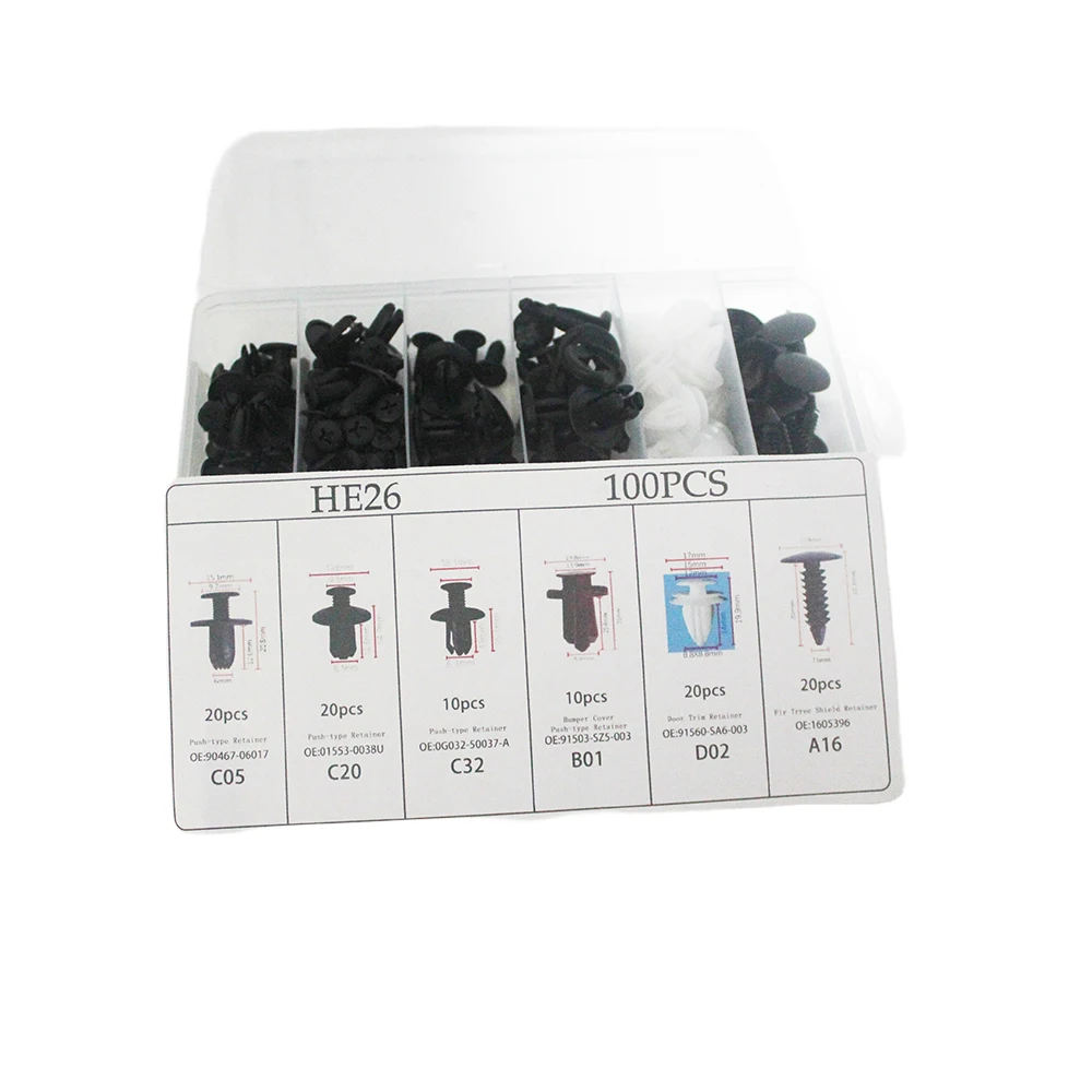 • Kit de sujeción de coche versátil:Este Kit de clip de sujetador de coche de 100 piezas es un conjunto completo, perfecto para varias reparaciones de automóviles y tareas de mantenimiento. Incluye clips de remache de guardabarros, pasadores de retención de empuje de cuerpo y retenedores de panel de ajuste de puerta de parachoques.