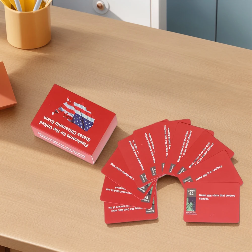 Característica:1.Cobertura integral:Las tarjetas flash de ciudadanía estadounidense de 2025 abarcan temas clave como el gobierno, la geografía, la historia, los derechos y las responsabilidades, brindando una comprensión exhaustiva necesaria para la preparación de las pruebas de ciudadanía.