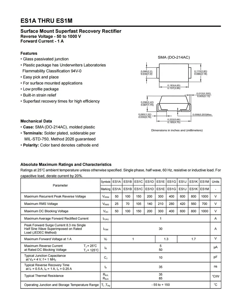 100 Uds ES1D ES1G ES1J ES1M SMA DO-214AC 1A 200V 400V 600V 1000V SF14 SF16 HER107 UF4007 SMD diodo rectificador de recuperación súper rápida