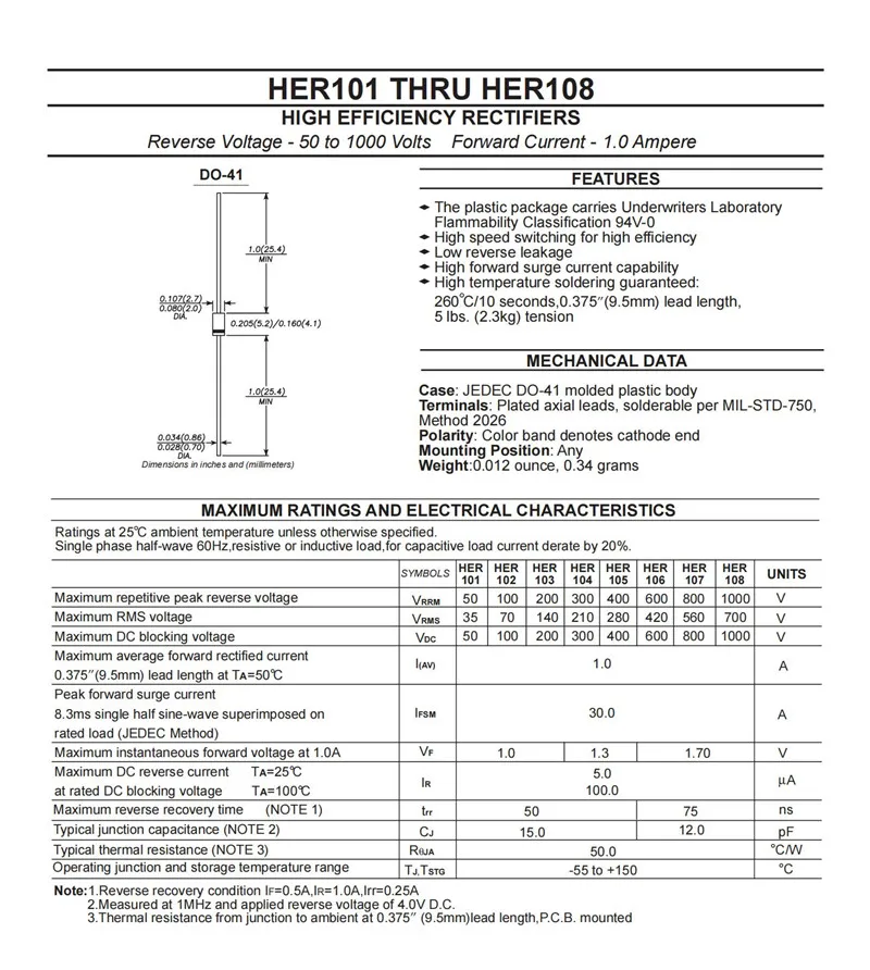 100 Uds HER104 HER107 HER108 DO-41 1A 300V 800V 1000V 1KV diodos rectificadores de recuperación ultrarrápida de alta eficiencia