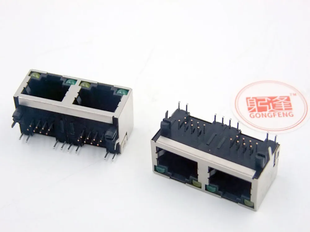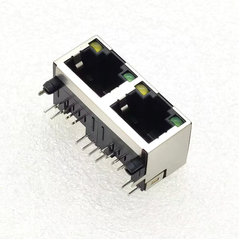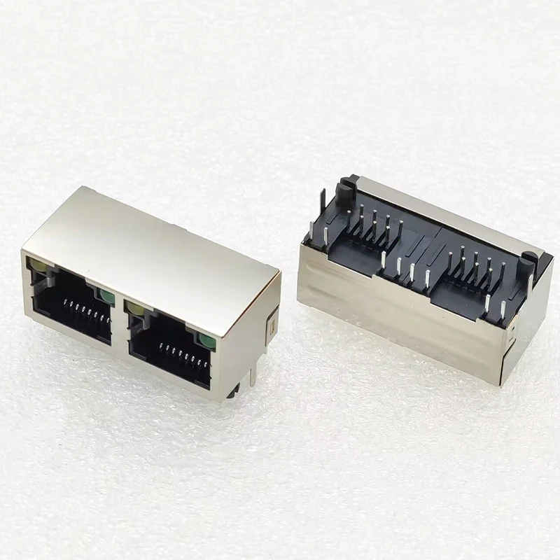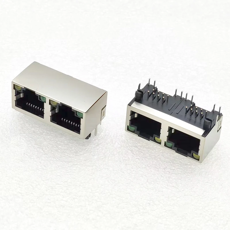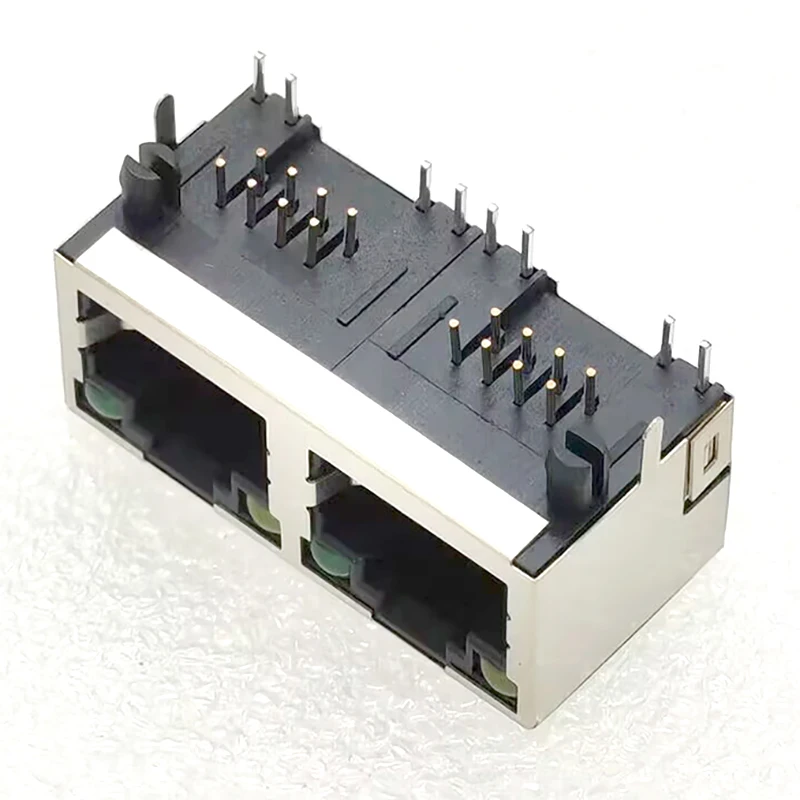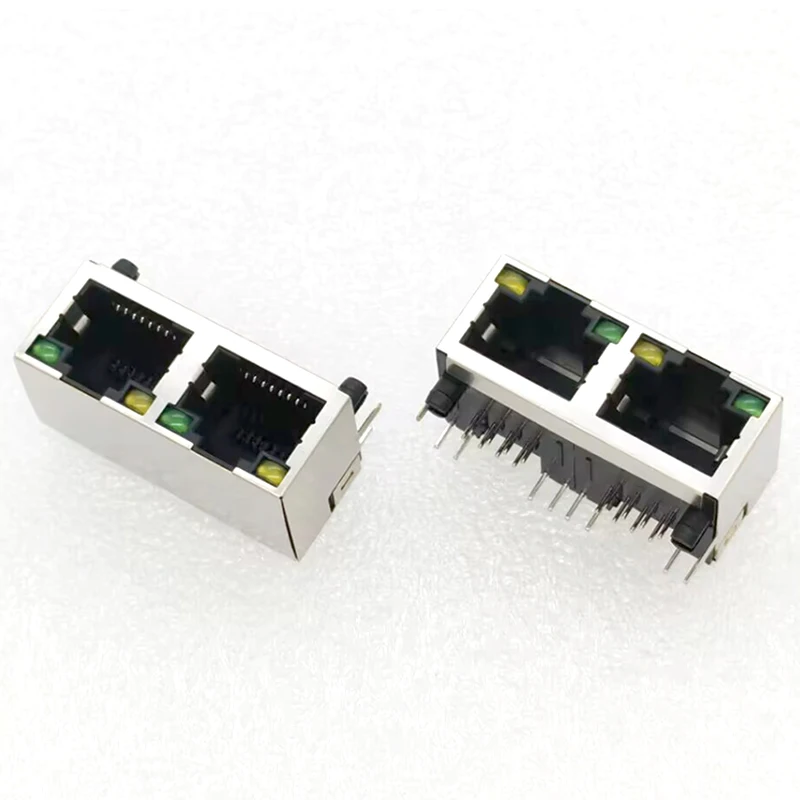 100 Uds conector RJ45 1X2 con interfaz de red ligera madre 56/8P8C conectores de Terminal con blindaje venta al por mayor de fábricaEnchufe RJ45 1X2 con luz interfaz de red RJ45 enchufe de flexión horizontal para asiento madre 2 56/8P8C con blindaje