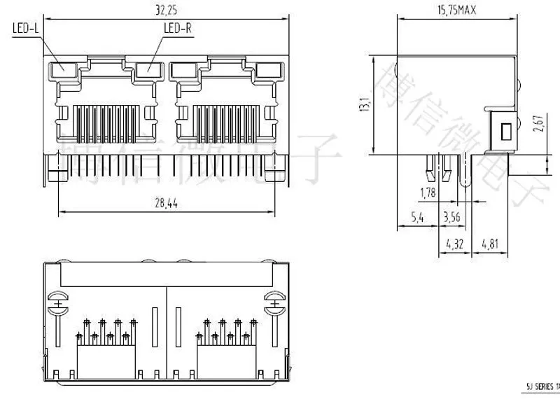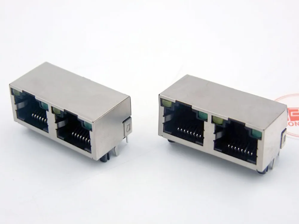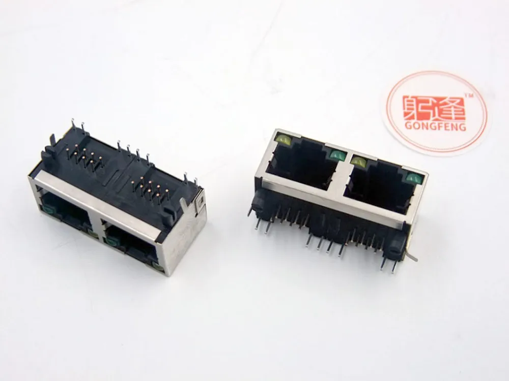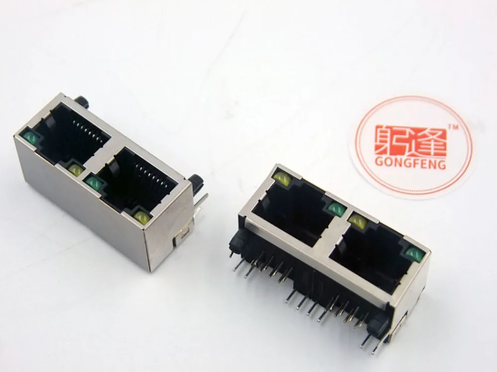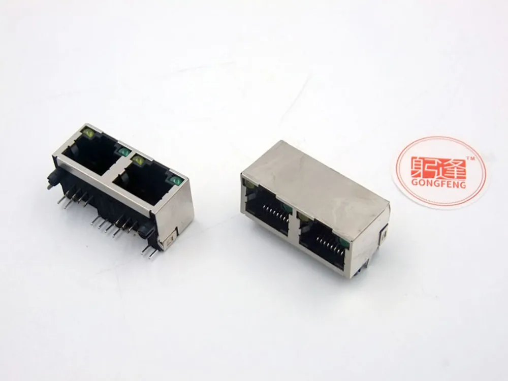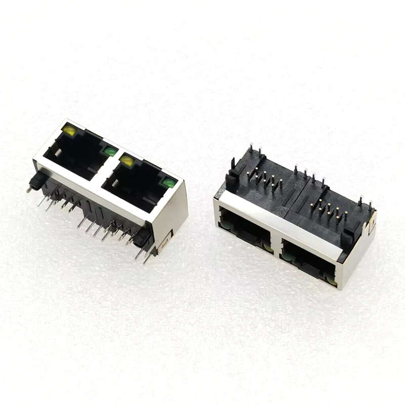100 Uds conector RJ45 1X2 con interfaz de red ligera madre 56/8P8C conectores de Terminal con blindaje venta al por mayor de fábricaEnchufe RJ45 1X2 con luz interfaz de red RJ45 enchufe de flexión horizontal para asiento madre 2 56/8P8C con blindaje