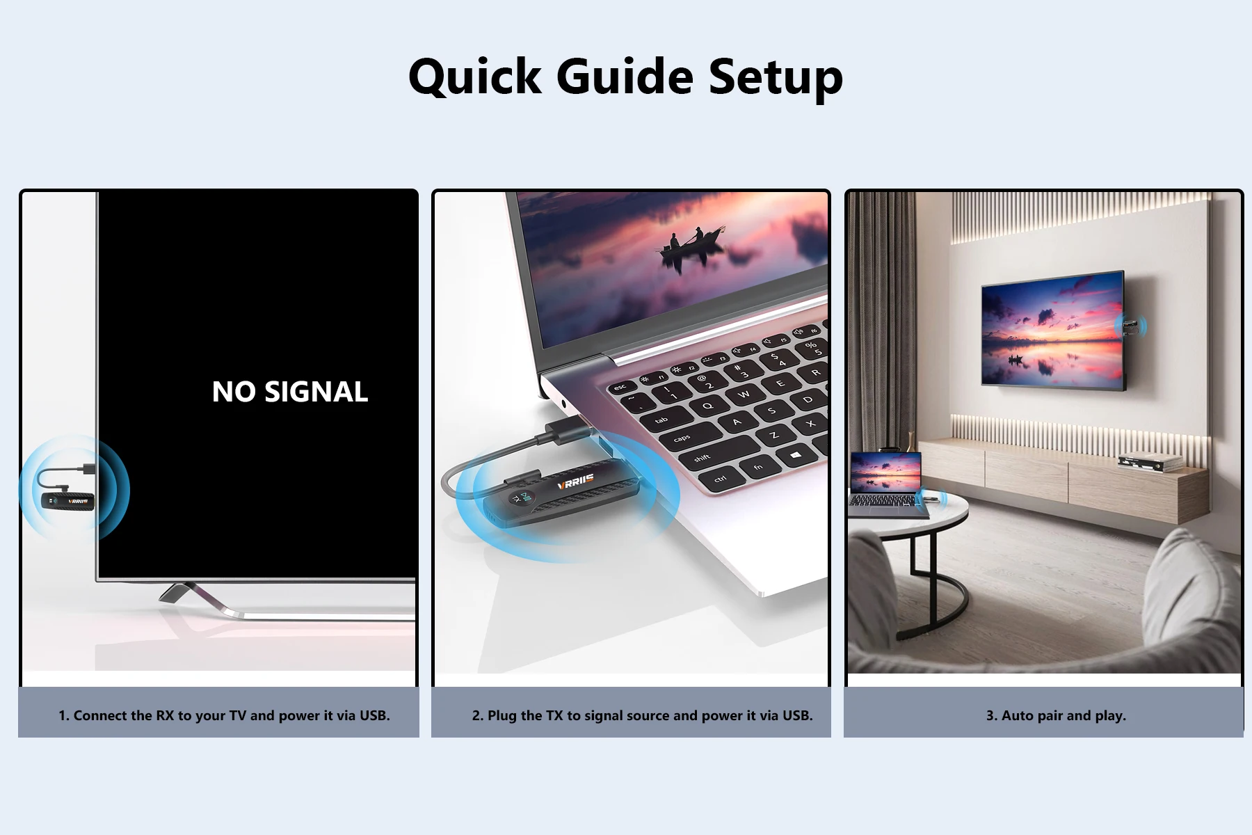 Transmitter (TX)Connect a computer or other device with HDMI video output function to easily mirror the display content of the screen, suitable for watching videos, playing games, and sharing screen content.