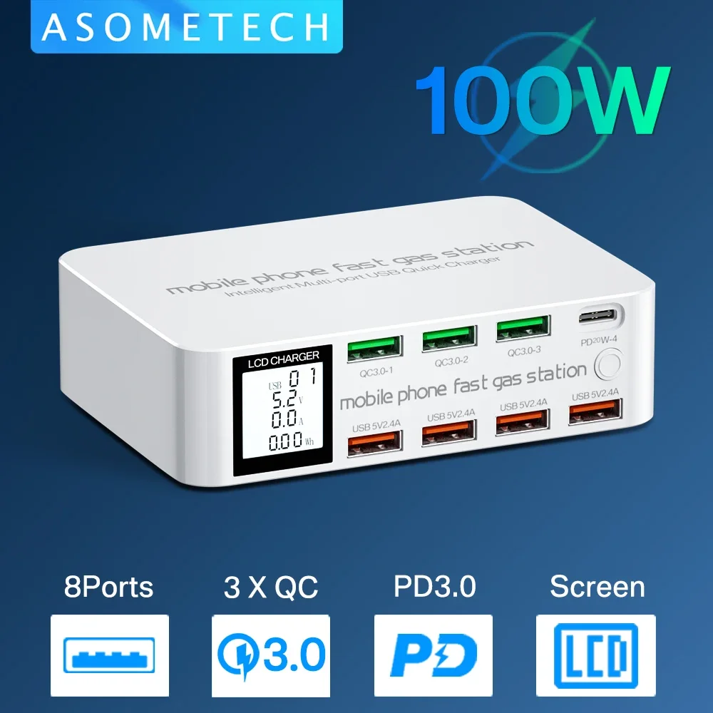 Comprar 100W 8 puertos pantalla LCD carga rápida 3,0 adaptador de cargador USB HUB tipo C PD cargador de teléfono rápido para iPhone Huawei Samsung Xiaomi