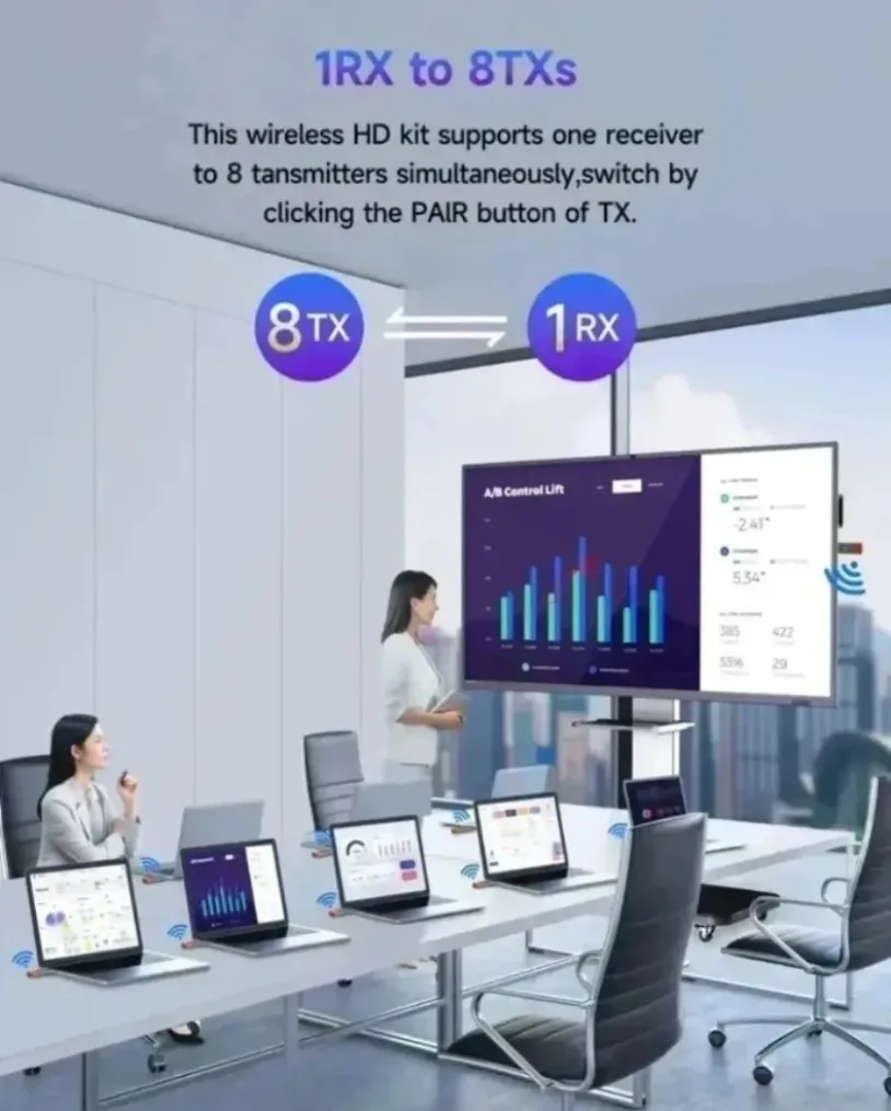 【Many-to-One Mode】1 transmitters can be connected to 1 receiver at the same time, one click switch, does not interfere with each other, and multiple screens can be shared. *Note: This operation requires additional purchase of transmitters, and the 1 receivers can support up to 1 transmitters.