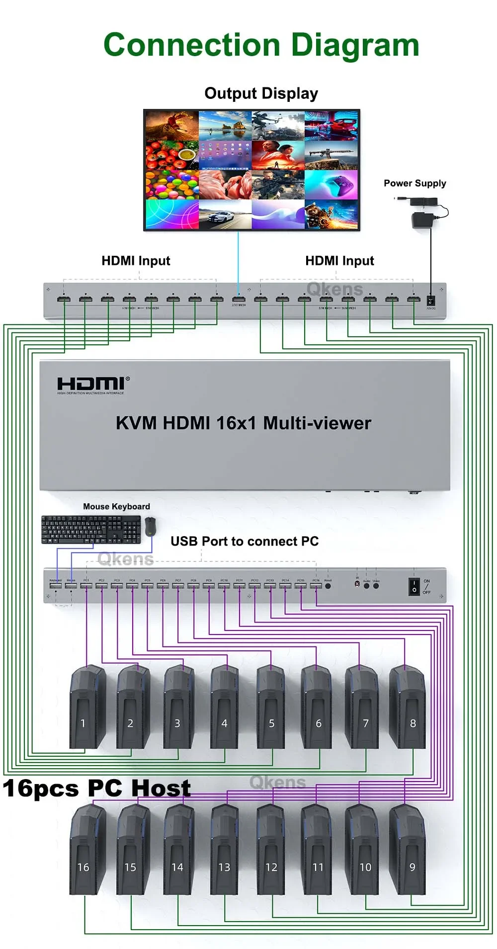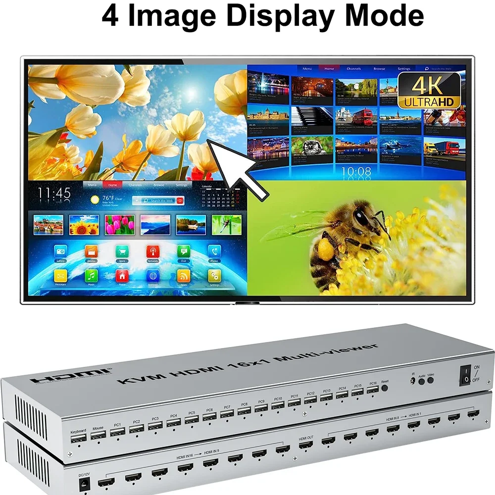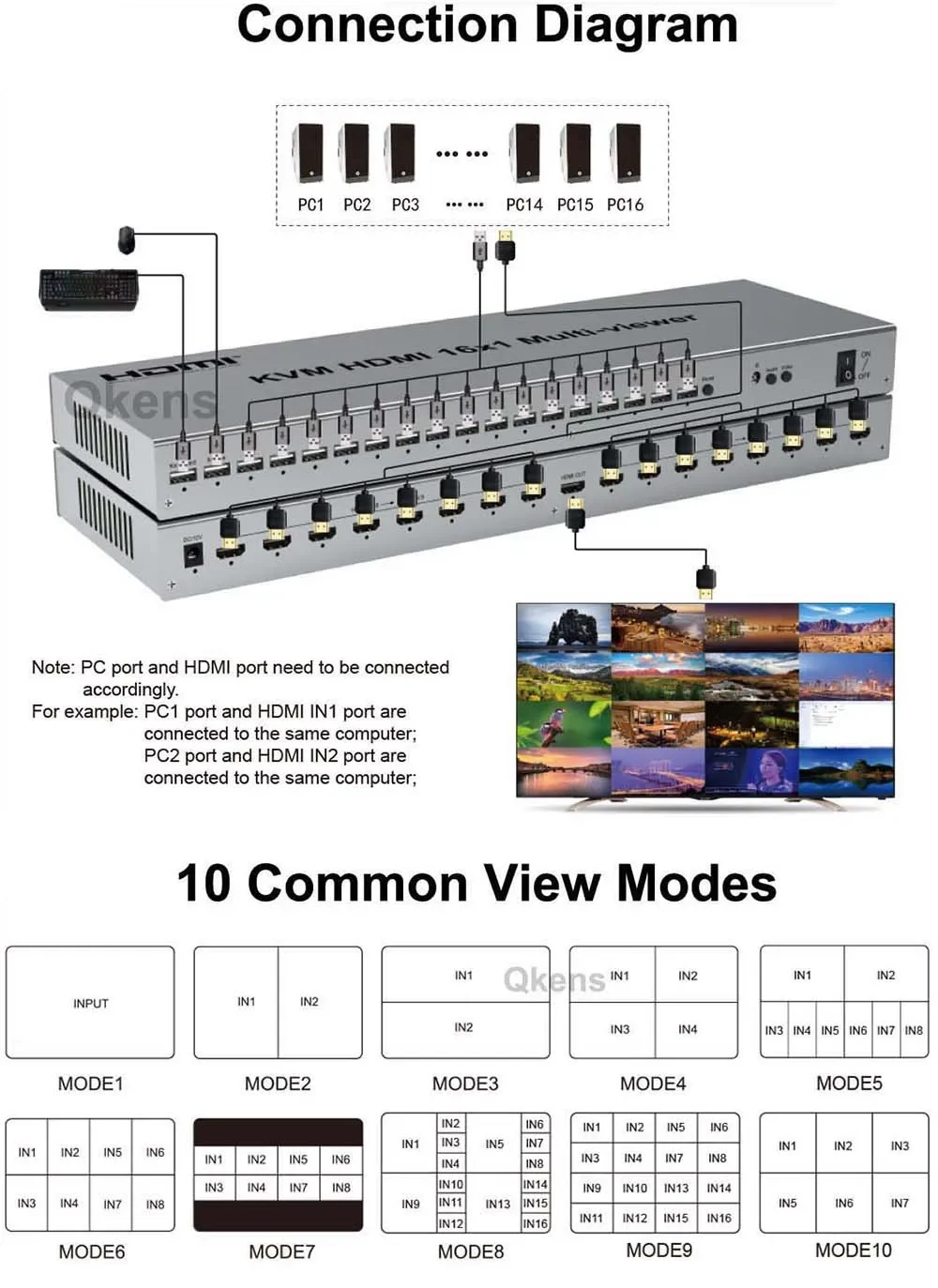 Contenido del paquete: 1080P KVM 16x1 HDMI Multiviewer x1PCS Adaptador de corriente DC12V x1PCS Un cable de extensión USB tipo x16PCS Control remoto sin batería x1PCS Guía del usuario x1PCS
