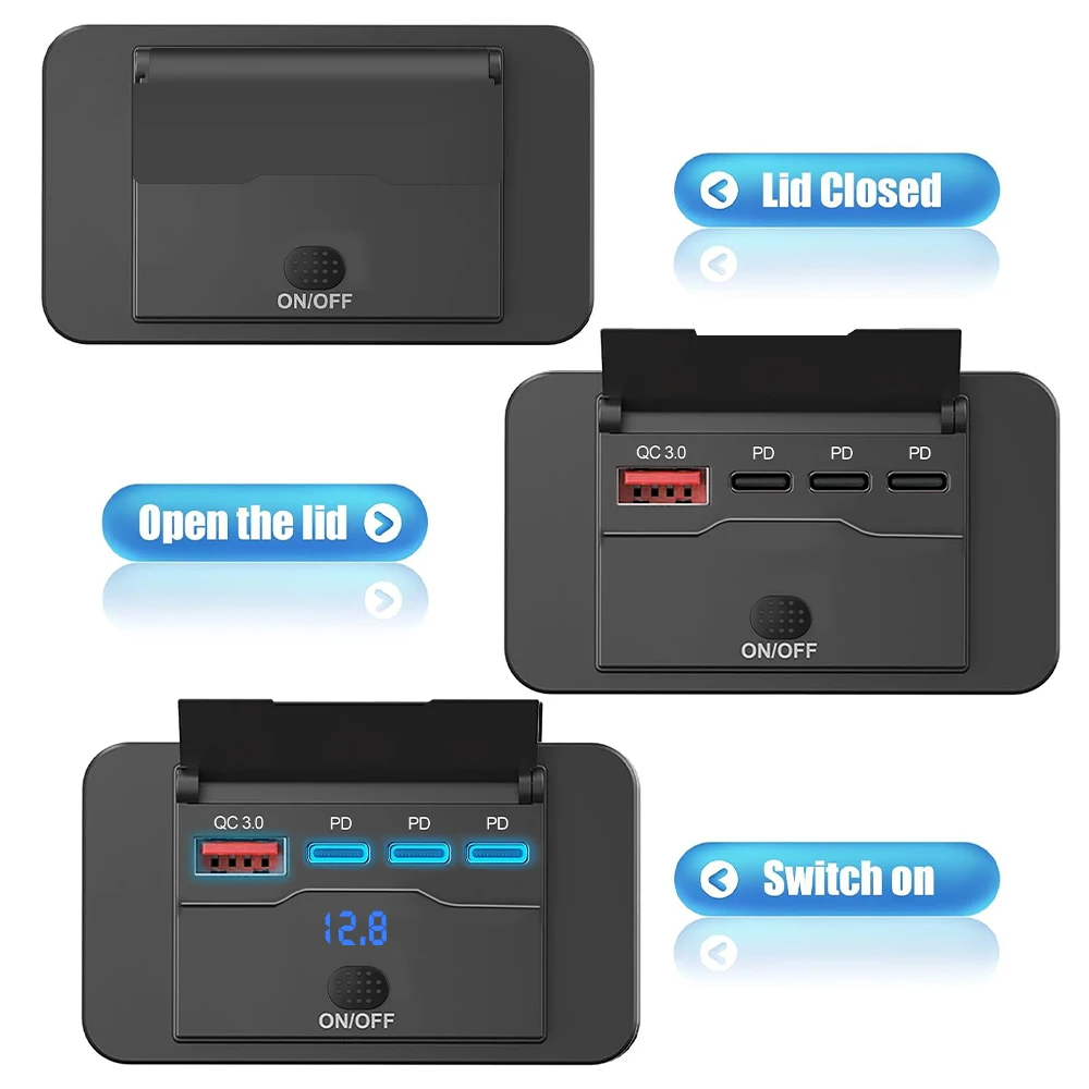 108W 4 puertos 12V RV salida USB 90W PD y QC 3,0 18W puerto cargador de coche accesorios con interruptor de voltaje para coche autobús RV