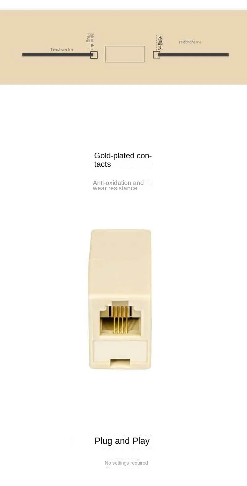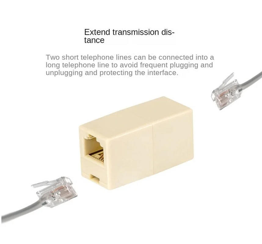 Uso: 2 líneas telefónicas están conectadas a una línea telefónica más larga a través del dispositivo de paso directo, la interfaz es conector RJ11 de cabeza recta hembra y la línea telefónica se extiende para conectarse