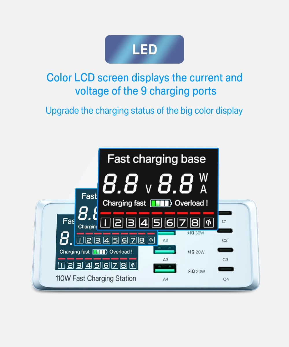 La pantalla LCD colorida muestra la corriente y el voltaje de los 9 puertos de carga Actualice el estado de carga de la pantalla grande a color