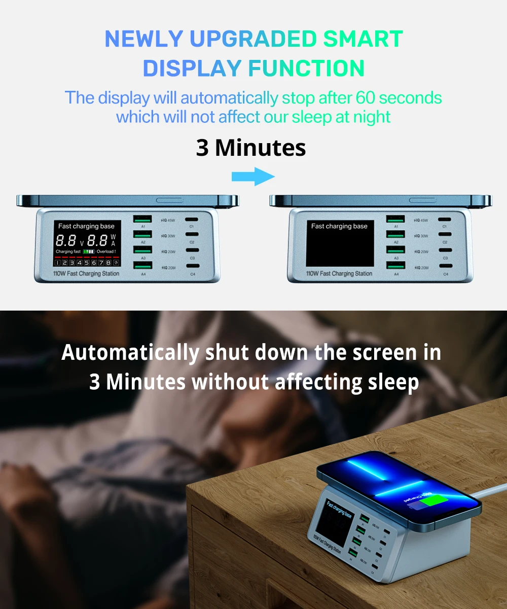 Con 8 puertos USB/Placa de carga sin conexión/Pantalla LCD