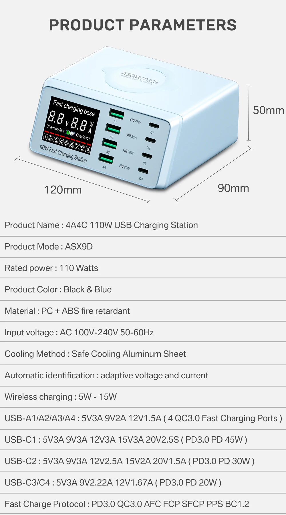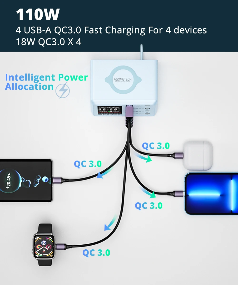 ASOMETECH - Estación de carga USB inalámbrica de escritorio de 110 W