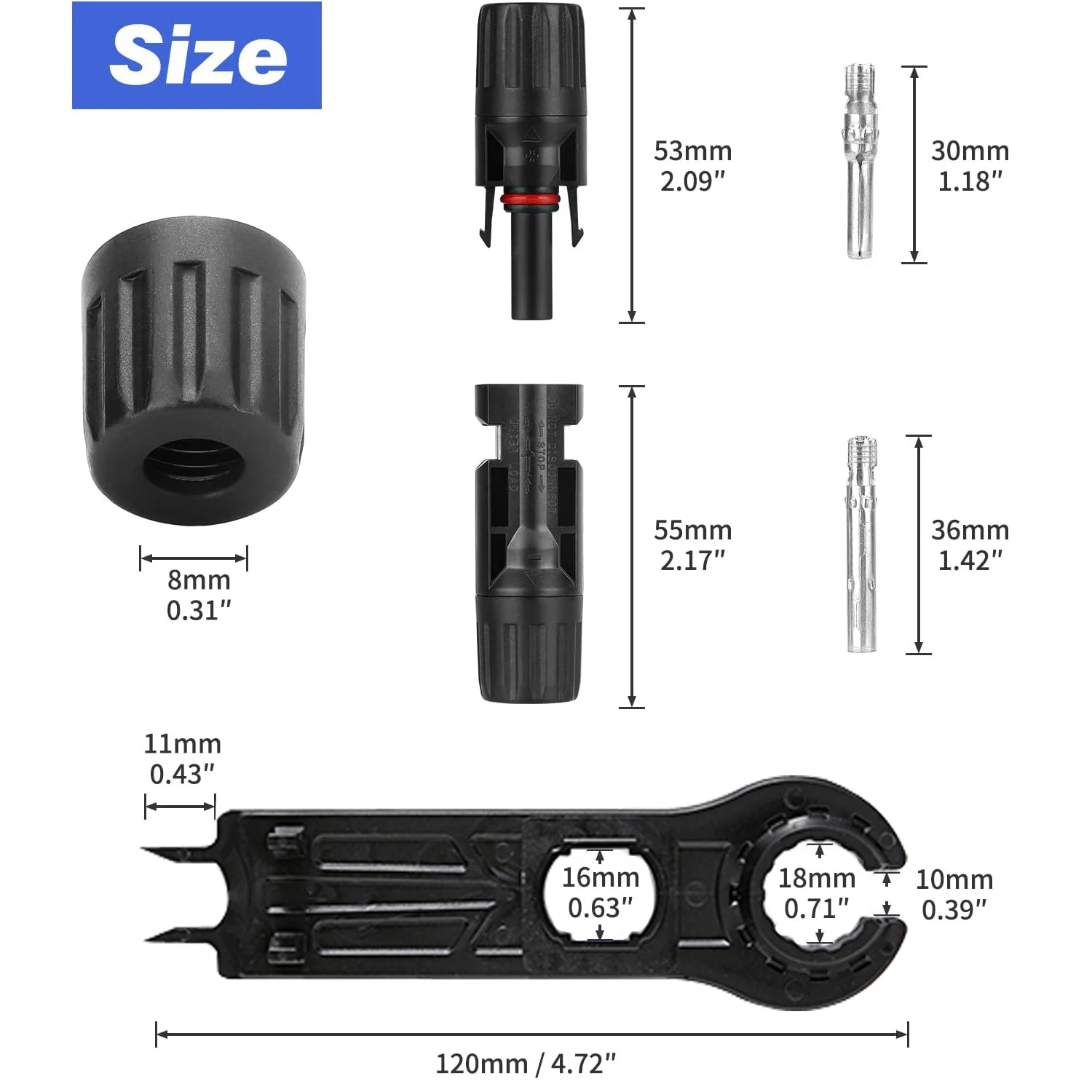 • Incluye: Conectores de panel solar con 12 piezas de conectores de panel solar (macho y hembra) y 12 piezas de pines de conector solar (macho y hembra) y un par de llaves para facilitar su instalación.