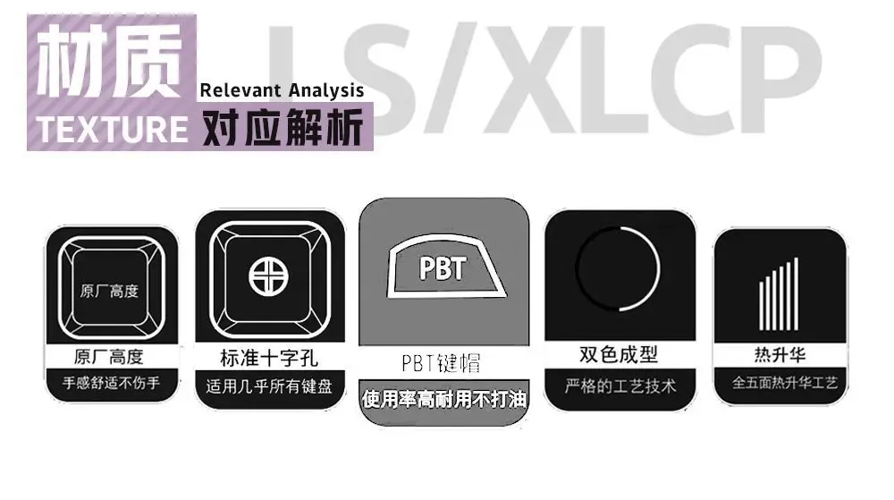 Material: PBT (superficie seca, textura clara, resistente a la corrosión, resistente al desgaste, no grasa, puede mantener las mejores condiciones durante mucho tiempo)