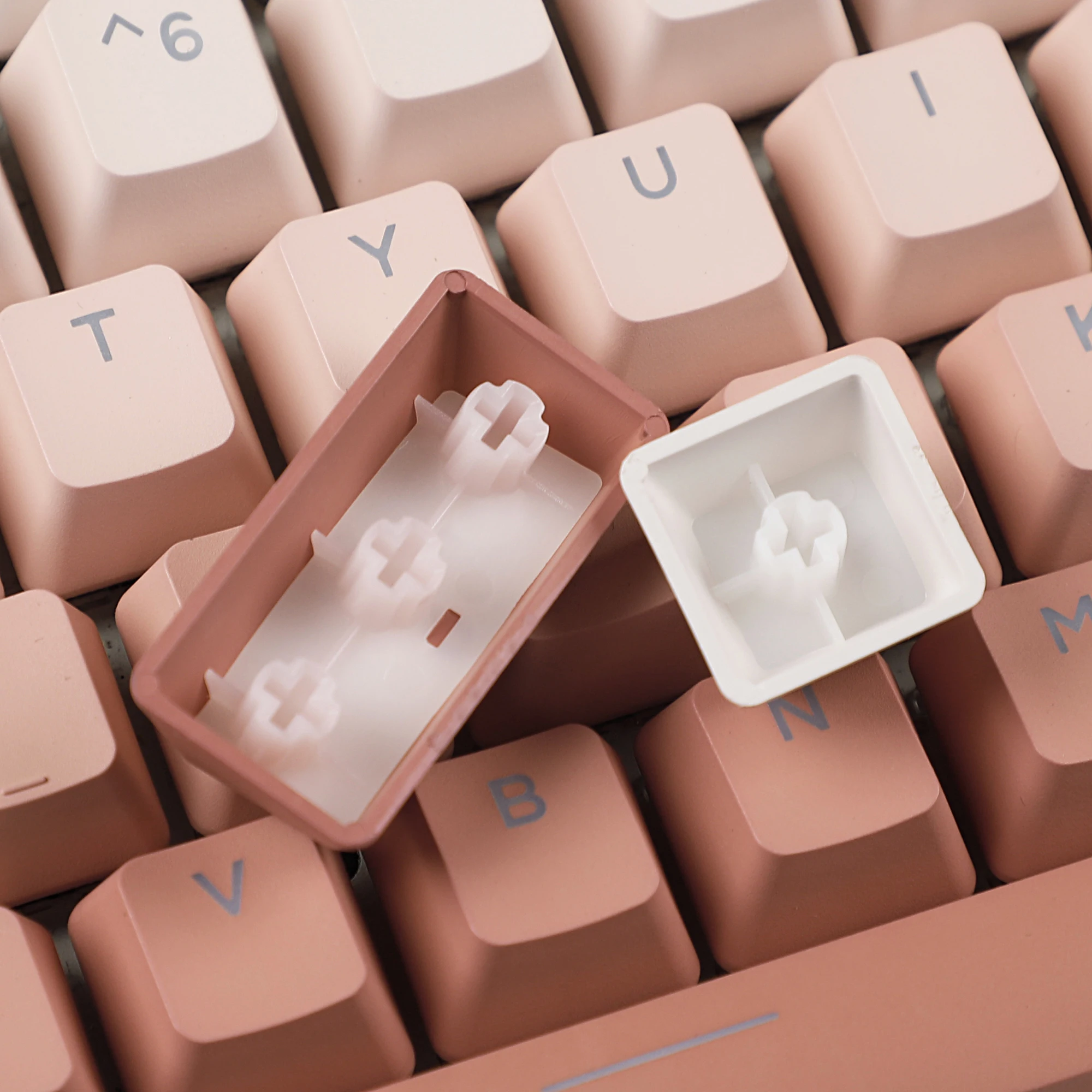 The keycap is made of PBT material,it's double shot and dyed which can let the shine through.