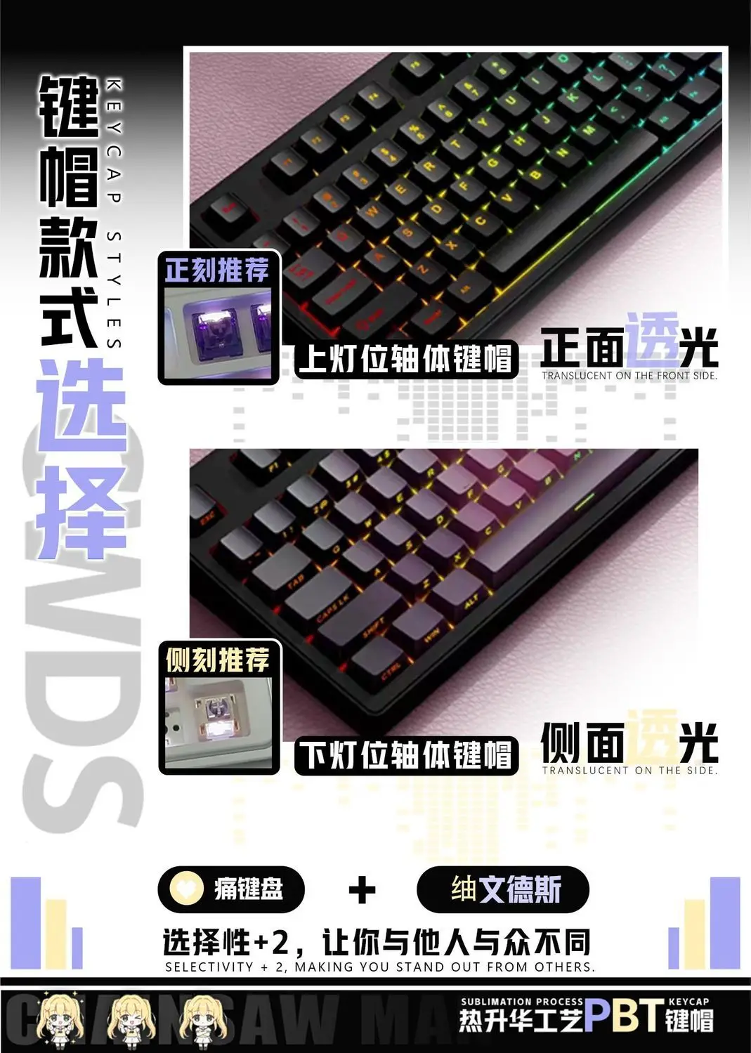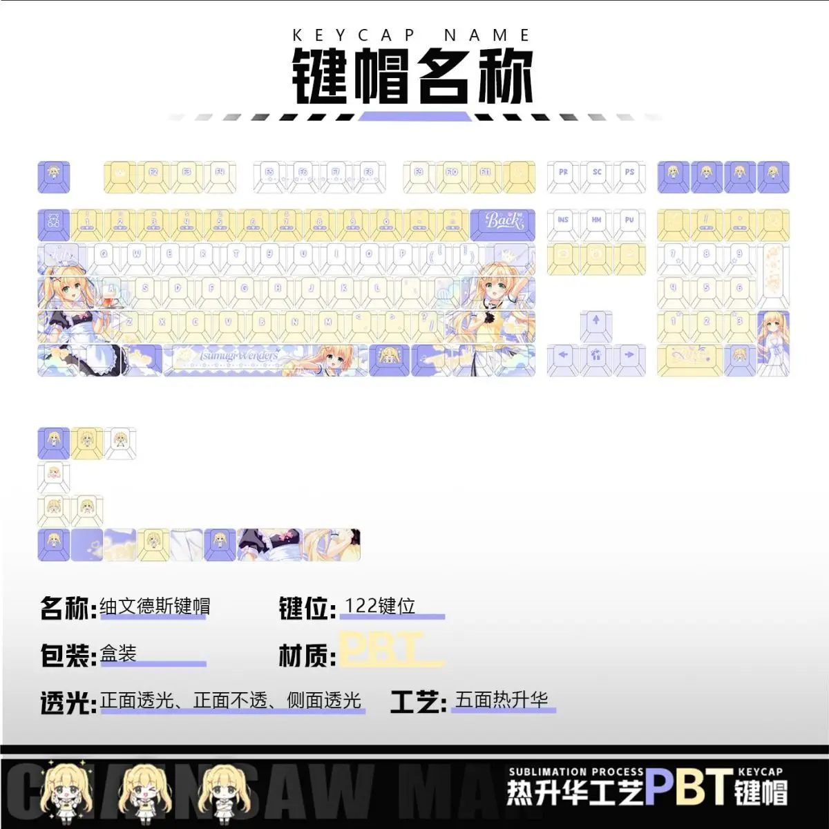 Material: PBT (superficie seca, textura clara, resistente a la corrosión, resistente al desgaste, no grasa, puede mantener las mejores condiciones durante mucho tiempo)
