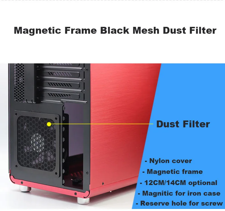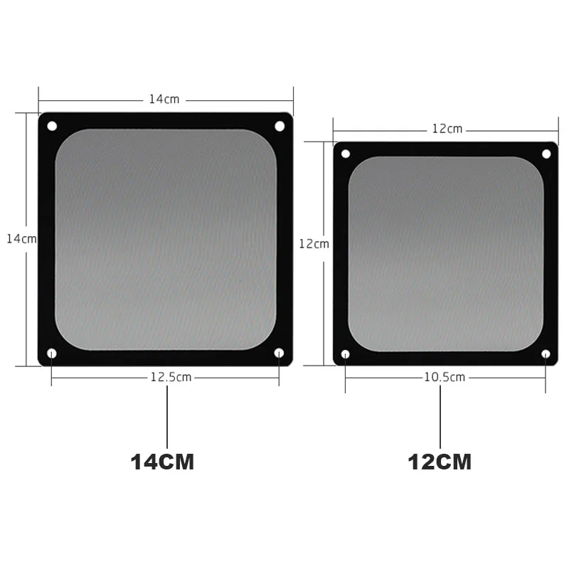 El paquete incluye: 1 malla de filtro de polvo y 4 tornillos de la piezas. Nota: 1. Marco magnético solo para caja de metal de hierro y acero. Para caja de aluminio y plástico, usa tornillos. Característica: Diseño de Marco magnético conveniente para una fácil instalación,