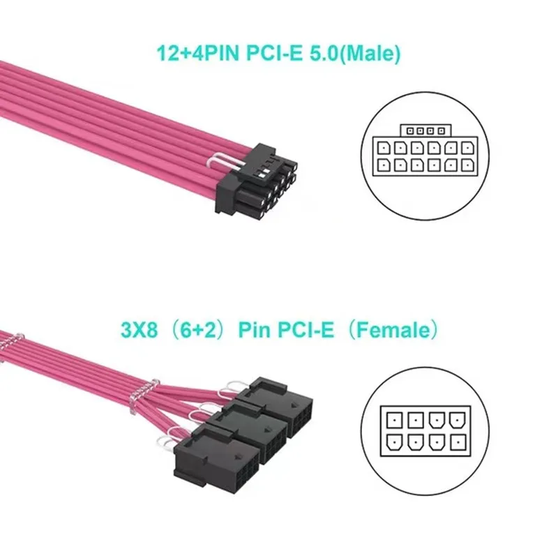 12 + 4 pines 16 pines a 3 piezas PCi-E GPU 8 pines tarjeta de vídeo gráfica 3x8 pines PCIE 5.0 Cable de extensión adaptador de fuente de alimentación RTX3090Ti, conector macho a hembra, no cable modular (conector macho a macho)2.Cable engrosado 16AWG con diseño de aguja completa 12+4P 16P, con calidad más garantizadaLa apariencia está envuelta con una manga negra, blanca y rosa, hermosa y moderna, también mejora la calidad.4.Rango de potencia de rendimiento del producto: 600WLista de embalaje: