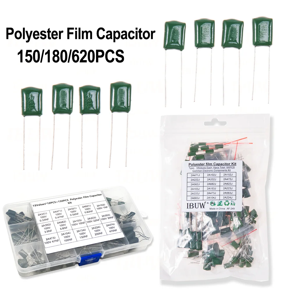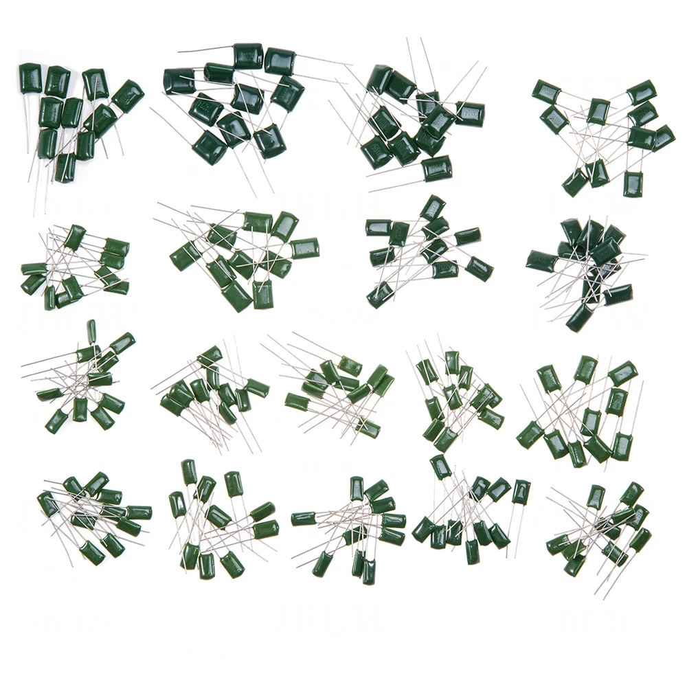 150/180/660PCS Kit de condensadores de película de poliéster 100V 1nF 1.5nF 2.2nF 100nF 2A102J 2A471J 2A222J 2A392J 2A332J 2A472J 2A103J 2A473J