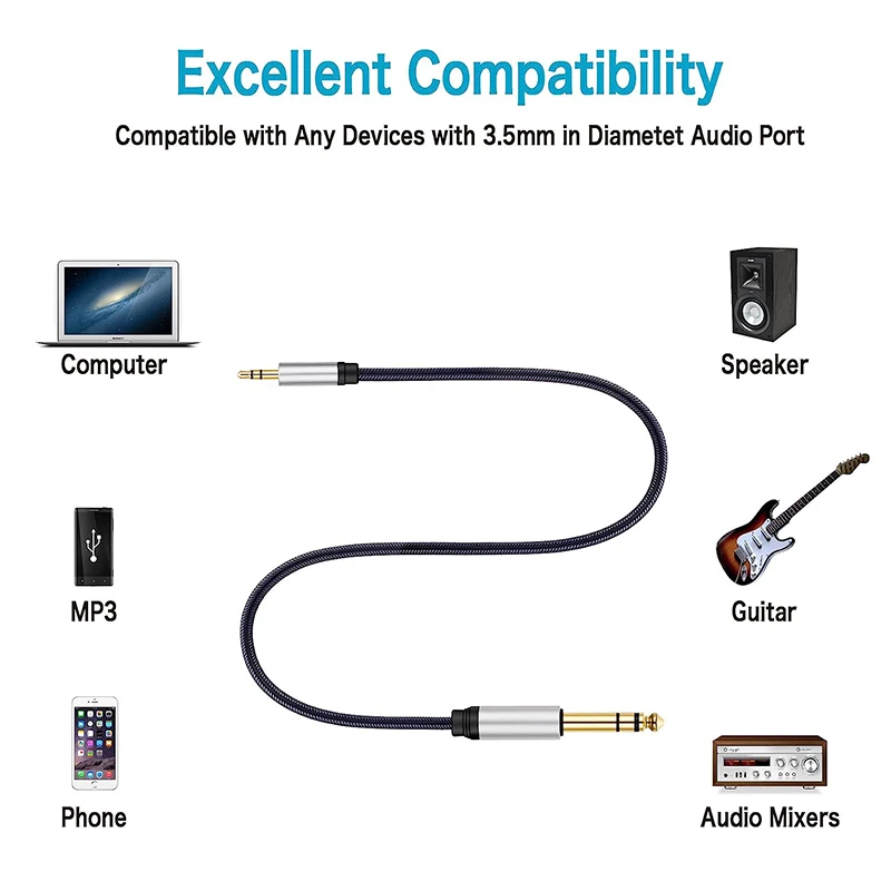 5. Wide compatibility: the 6.35 mm jack plug of this 1/4 to 3.5mm cable fits all devices with a 6.35 mm jack socket, compatible with the Yamaha keyboard, Casio keyboard, Roland keyboard, electric keyboard, digital piano, home theatre, speaker, bass amplifier, recorder, mixer, guitar, etc. The 3.5mm end is compatible with all devices with a 3.5mm jack