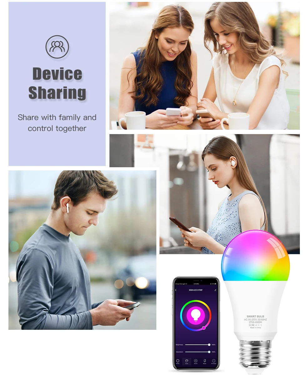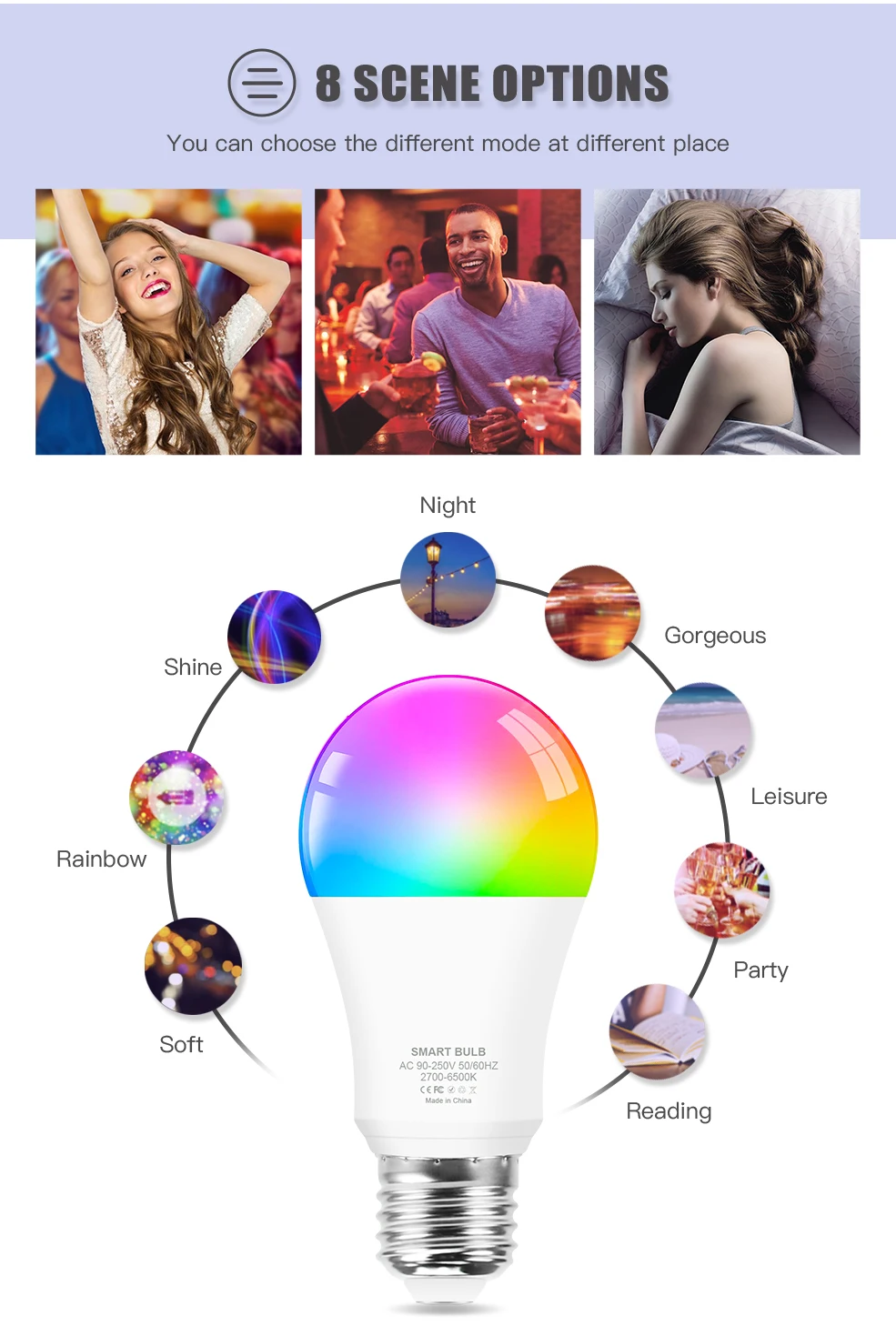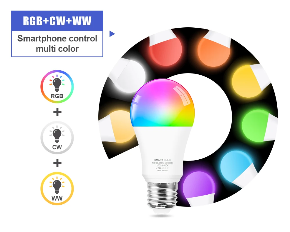 Compatible con control por voz:La bombilla inteligente funciona con Alexa Echo, Google Home Assistant, puede controlar la bombilla inteligente a través de su voz y solo necesita dar un comando de voz para encender/apagar o atenuar/iluminar la luz (por ejemplo.'Alexa, configura el dormitorio en azul').Control de aplicación remota:Encender/apagar Siri, Alexa y Google Home habilitó la bombilla inteligente ya sea que esté en casa o fuera, solo necesita descargar una aplicación de "vida inteligente".Puedes crear un grupo para todas tus bombillas inteligentes y controlarlas todas con un solo comando.Bombilla inteligente RGBCW y multicolor:La bombilla inteligente RGB de color blanco frío y blanco cálido crea tus efectos de luz favoritos con 16 millones de colores y el brillo de cada color es regulable.Amplia aplicación y sistema de escena:Puede configurar diferentes modos de luz en Smart Life para que coincidan con varias ocasiones, incluida la cocina, la sala de estar y el dormitorio.También se puede utilizar para lámparas de mesa, cafeterías, bares, fiestas, etc.y tiene estas funciones Paleta de colores, control de grupo, luz solar, temporizador, amanecer, atardecer, regulable, función de micrófono, modo de bricolaje, modo de escena.Ahorro de energía:Bombilla inteligente de 15W 1500lm con casquillo E26/E27, equivalente a bombillas incandescentes tradicionales de 100W. Ahorra hasta un 80% de energía, dura más y ahorra energía.
