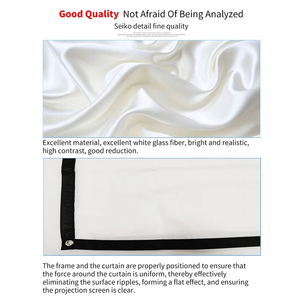 Cortina de proyector simple 16:9 60 72 84 100 120 Pantalla de visualización HD portátil de 150 pulgadas para el hogar y la Oficina al aire libre Especificación: Material: poliéster Color blanco Relación: 16:9 Tipo: 60 pulgadas, 72 pulgadas, 84 pulgadas, 100 pulgadas, 120 pulgadas, 150 pulgadas (opcional) Tamaño del embalaje: 360 X 260 mm/14,17 X 10,24" Consejo cálido: 60-100 pulgadas con 4 ganchos, 120 pulgadas con 8 ganchos y 150 pulgadas con 12 ganchos.