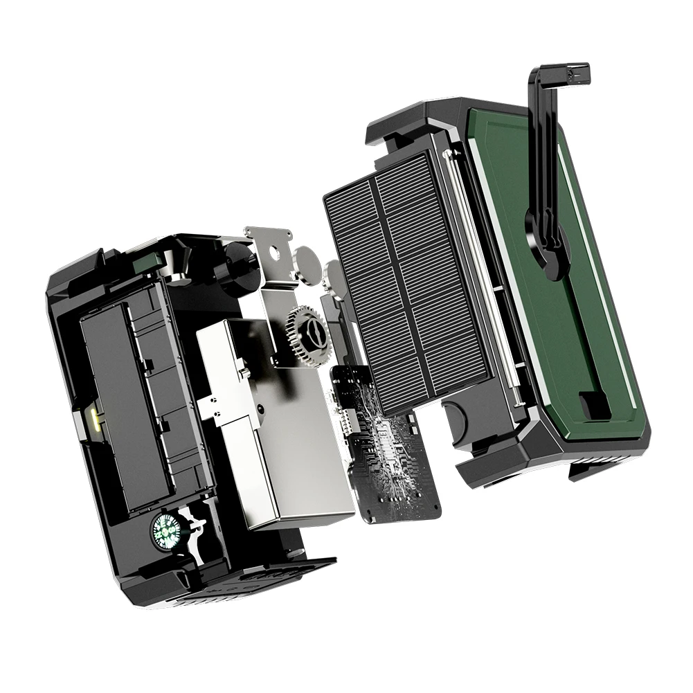 2.Panel de carga solar:Equipada con un panel solar (5 V 0,65 W) hecho de silicio monocristalino, la Radio meteorológica de emergencia convierte eficientemente la luz solar en energía.Cargue en áreas exteriores soleadas y disfrute del futuro de la comunicación de emergencia sin preocuparse por la batería.