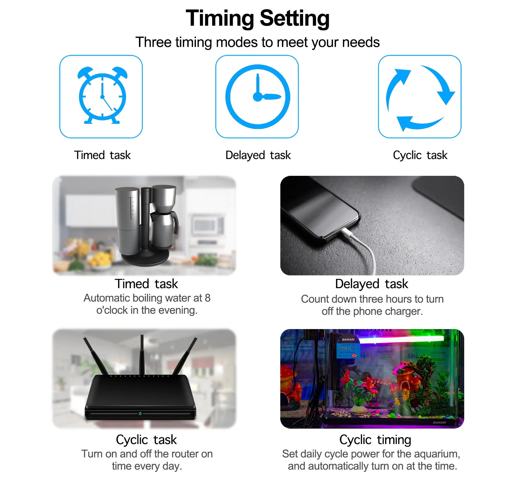 - Enciende su electrodoméstico, como ventilador, humidificador, dispensador de agua, luces, horno microondas y más en la hora exacta que configuró, sin perder nunca su energía con la función de cuenta regresiva del dispositivo.