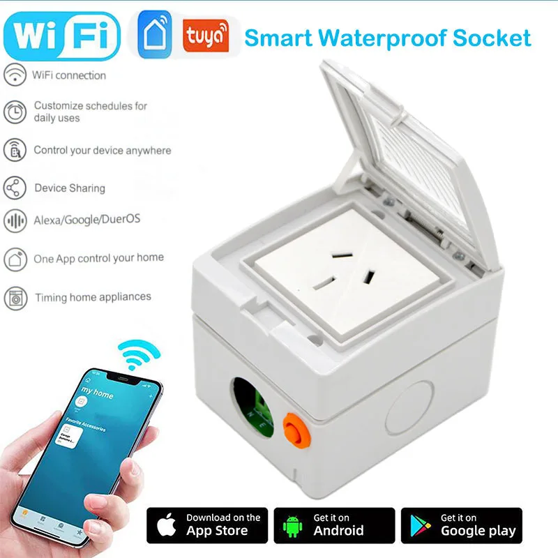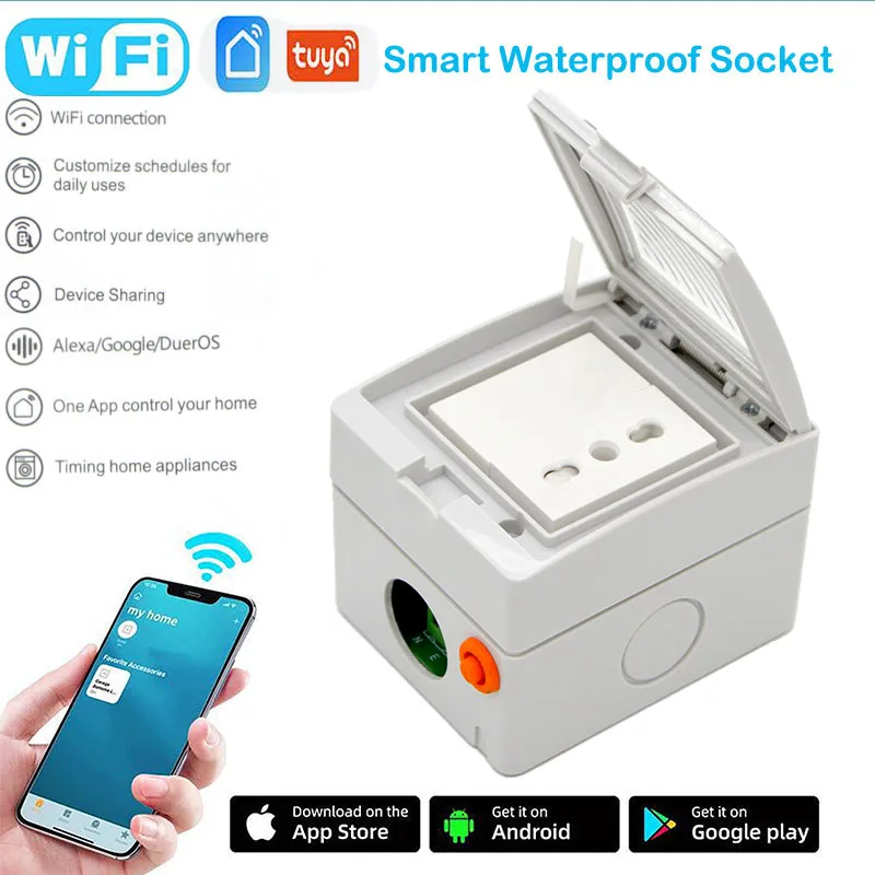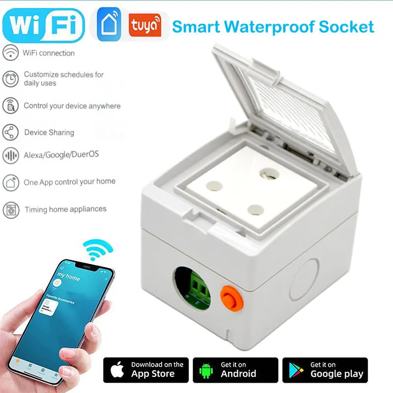 Tuya 16A Fr ,EU,UK,US WiFi Smart Socket IP55 Bathroom Wall Waterproof Power Supply Jack With Smart Life App Remote Control