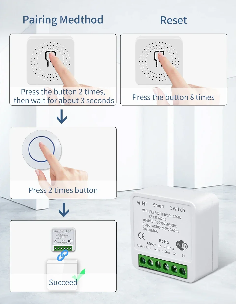 Paso 1: Presione el botón de aprendizaje (en el receptor) dos veces.Espere 3 segundos;