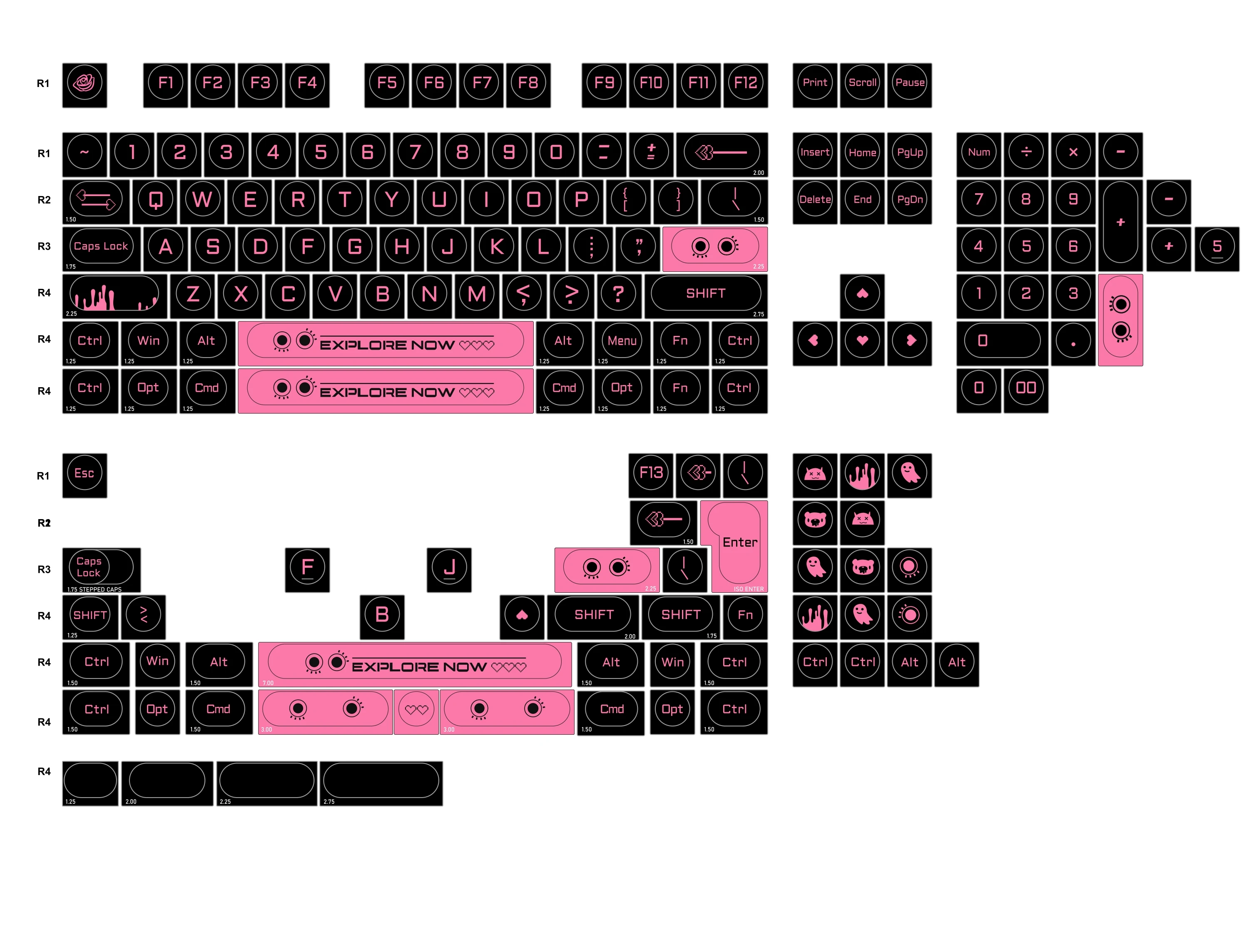 Negro Rosa:Esta tecla viene en una combinación de colores negro y rosa y también viene con lindas teclas personalizadas.Hay un estilo genial y dulce que agrega una apariencia elegante y personalizada a su teclado.