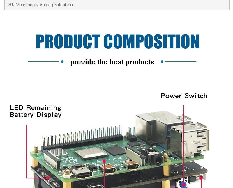 Esta es una nueva versión de la placa UPS, que no solo admite Raspberry Pi 4B, sino que también agrega una salida tipo C. Proporciona suficiente energía para Raspberry Pi, para que su Raspberry Pi pueda seguir funcionando cuando se mueve, y su diseño inteligente le permite deshacerse de los cables problemáticos. El UPS puede proporcionarle la operación de reemplazar la batería usted mismo. Puede utilizar la mayoría de las baterías estándar 18650 y cumplir con las características de la batería en términos de duración de la batería. Además, la pantalla de alimentación proporcionada en la placa de circuito también es fácil de usar. La luz LED luminosa puede mostrar rápidamente la energía restante y soportar la descarga durante la carga. Puede conectarse directamente a una fuente de alimentación externa para cargar. Al mismo tiempo, Raspberry Pi no se apagará. Primero instale la batería y luego conecte el UPS a la Raspberry Pi. Nota especial: ! ! ! ! ! No invierta la batería. Este producto es un dispositivo de suministro de energía. Mantener fuera del alcance de los niños. Consulte estrictamente la descripción del producto de UPS. Si se invierte la polaridad de la batería, quemará directamente el chip de administración de energía del dispositivo e incluso provocará un incendio o lesiones personales. No agregue ningún componente usted mismo, las consecuencias de todos los daños accidentales causados por los motivos corren por su propio riesgo.