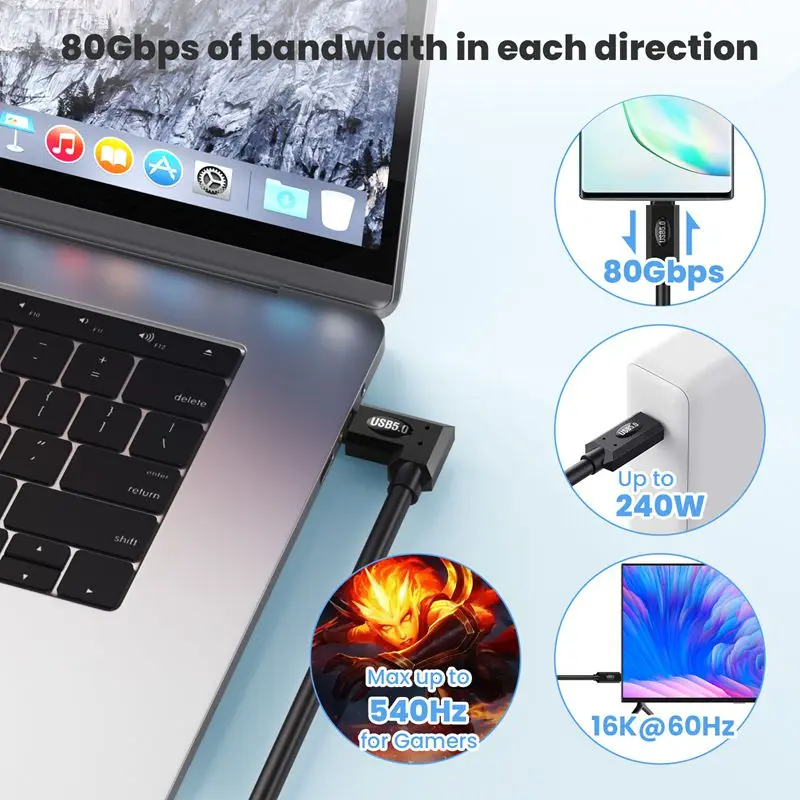 El cable USB 5, con una velocidad de transferencia de datos bidireccional de 80 Gbps, puede sincronizar y transferir rápidamente archivos grandes (como videos de alta resolución y modelos 3D complejos), reducir el tiempo de espera y mejorar la eficiencia del trabajo.