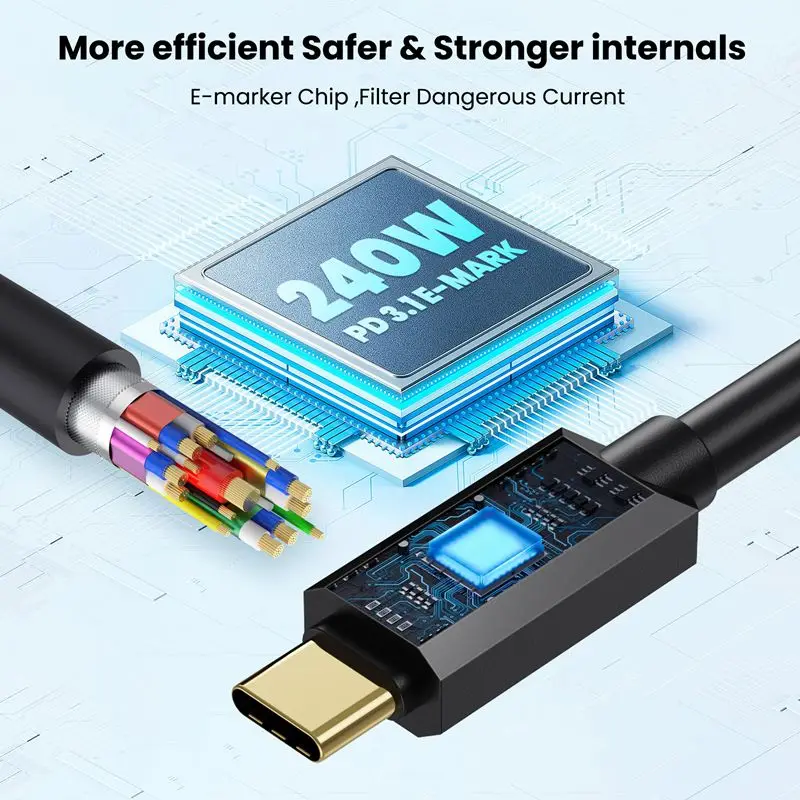 Admite el estándar PD 3.1, puede proporcionar una potencia de salida de hasta 240 W y puede cargar de manera eficiente computadoras portátiles, tabletas y otros dispositivos de alto rendimiento.Dígale adiós al desorden de cables y adaptadores de corriente en el espacio de trabajo, y un solo cable de conexión puede lograr funciones de carga de alta velocidad y transmisión de datos/vídeo de primer nivel.Compatibilidad con versiones anteriores de 60W, 100W y 140W.Satisfaga todas sus necesidades de carga.Además, está equipado con un chip E-Marker para garantizar la seguridad, la estabilidad y la protección de la batería.