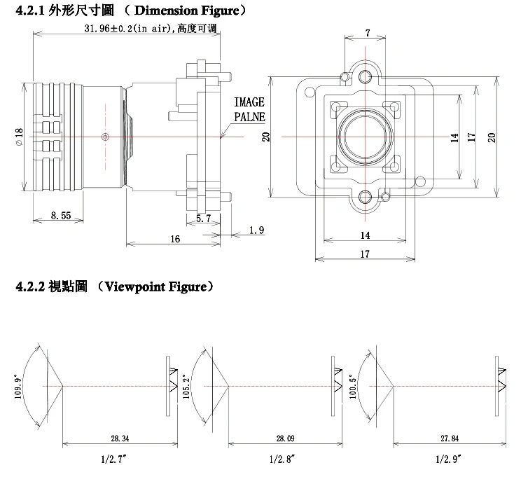 1.Formato de 1/2,7", uso para sensores de imagen de tamaño más pequeño (1/2,8", 1/2,9", 1/3", 1/4", p.Obtendrá un ángulo de visión más pequeño.