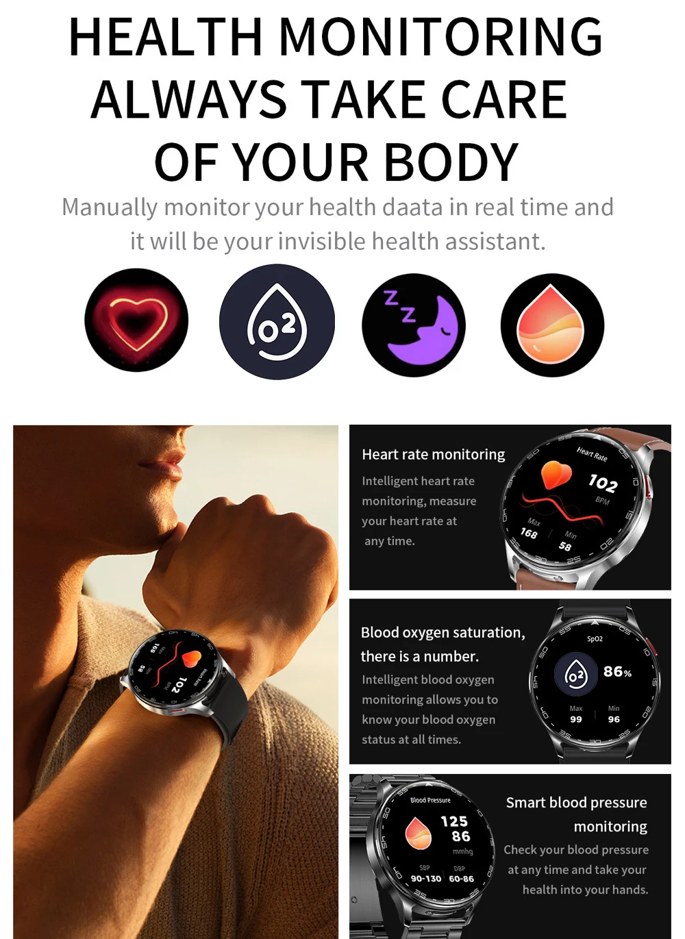 1. Los dispositivos portátiles monitorean las actividades humanas a través de sensores electrónicos.Están al nivel de la electrónica de consumo.Es normal que haya cierta desviación.Los resultados de las pruebas sanitarias del reloj son solo de referencia y no se pueden comparar con equipos médicos.Cuando el reloj se coloca en la superficie del objeto, habrá frecuencia cardíaca/presión arterial y otros resultados de pruebas.Es normal y no es un defecto del producto.