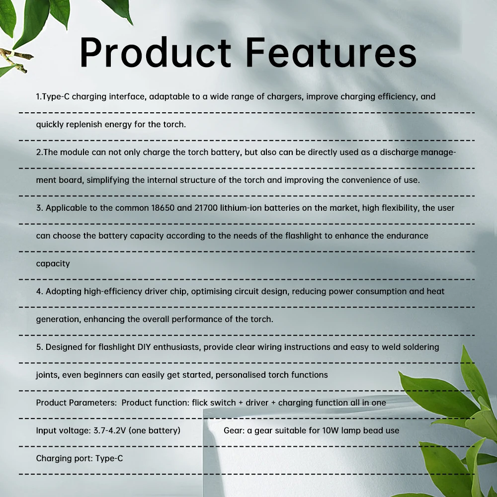 2.El módulo no solo puede cargar la batería de la linterna, sino que también puede usarse directamente como placa de gestión de descarga, simplificando la estructura interna de la linterna y mejorando la comodidad de uso.