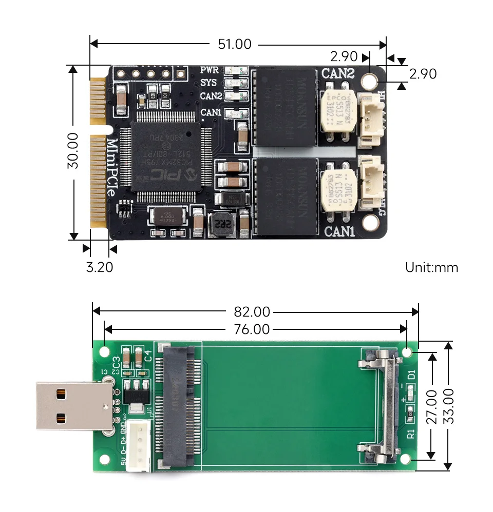 El MiniPCIe CAN de 2 canales amplía dos interfaces CAN, adopta el tamaño de tarjeta MiniPCIe estándar y se puede instalar fácilmente en una computadora portátil o computadora industrial con ranura MiniPCIe e integra dos circuitos completos de interfaz de aislamiento CAN.Admite sistemas Windows y Linux, viene con controladores, software relacionado con CANTools, ejemplos de desarrollo secundario y tutoriales.Viene con una placa adaptadora USB A MiniPCIe, para conectarse a PC o hosts de control industrial a través del puerto USB para realizar el control del transceptor, análisis de datos, recopilación y monitoreo de la red de bus CAN.De tamaño compacto y fácil de usar, se puede utilizar para el aprendizaje y depuración del bus CAN, y el desarrollo e integración secundarios en diversas aplicaciones que requieren comunicación en bus CAN.