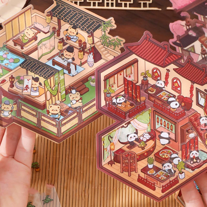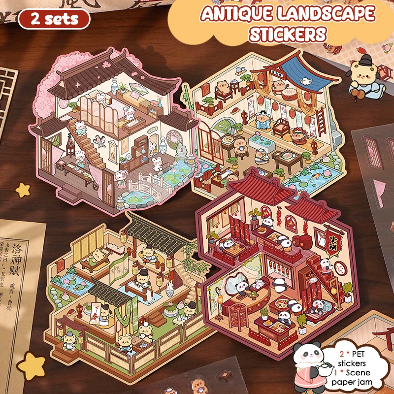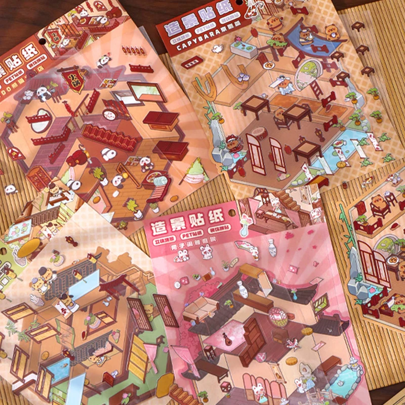 Comprar 2 juegos de pegatinas de paisajismo 3D de dibujos animados, pegatinas de pegado apilables de escena de cabina, pegatinas de escena en miniatura bonitas, regalos de Festival
