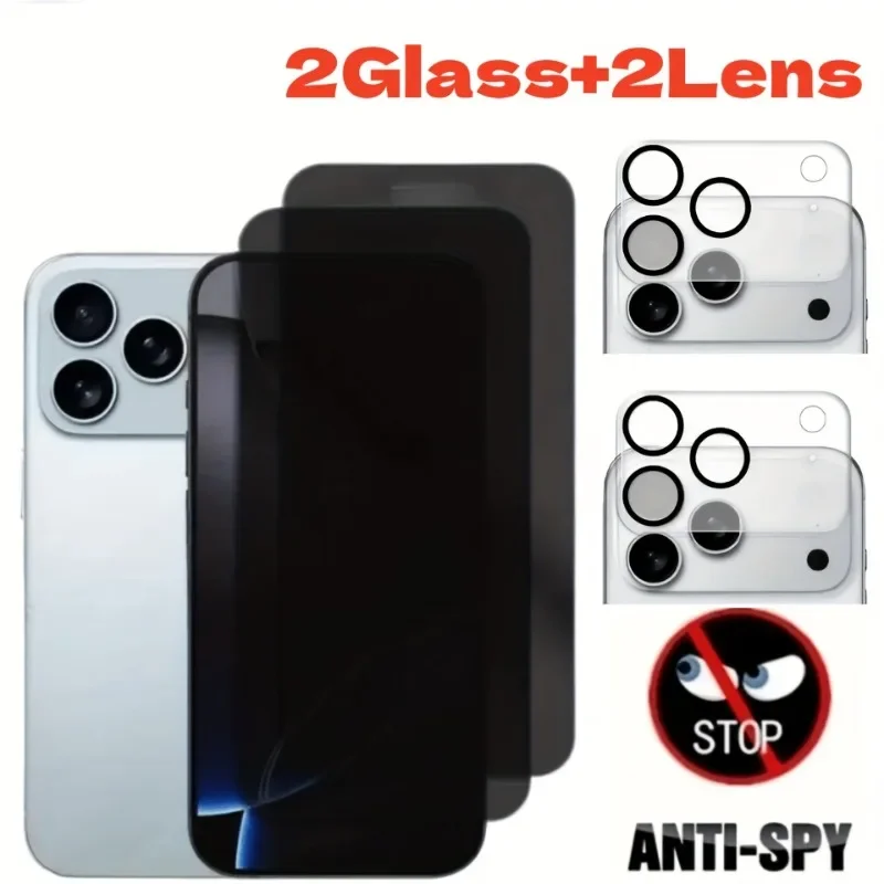 2 protectores de pantalla de privacidad + 2 lentes de cámara compatibles con iPhone 17 16 15 14 13 12 11 Pro Max 15 14Plus 13 12 16e Air