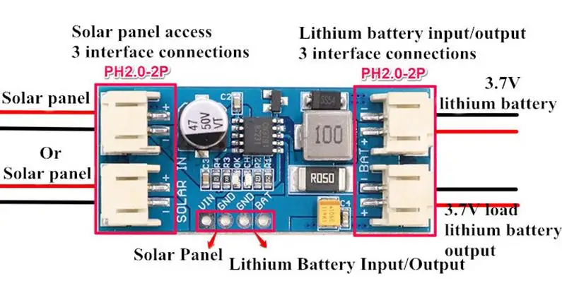 El casquillo SOLAR PH2.0X2P +- y las dos almohadillas +- izquierdas son conductores, conectados al panel solar;