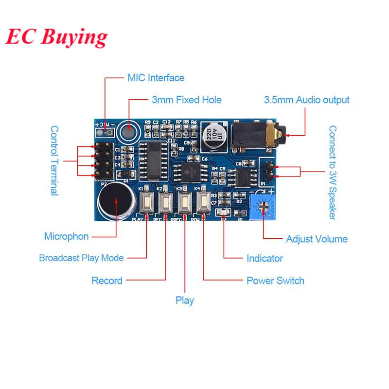 Introducción del producto:Este módulo es un módulo de voz de grito de altavoz de grabación, con funciones de grabación, reproducción y grito, se puede utilizar en diseño de un solo chip, grabación de monitoreo de lugares especiales, escaleras mecánicas, pasillos, sitios de construcción y otros lugares, advertencias de transmisión de voz y altavoces.Parámetros del producto:Voltaje de fuente de alimentación: CC 3,6,5 VCorriente de alimentación: 0,3ATiempo de grabación: 4 minutosFrecuencia de muestreo: muestreo de 32K 48bit/sSalida del amplificador de potencia incorporado: 3W 4-8REspecificaciones del micrófono incorporado: 9*7mm 50dbEspaciado entre pasadores: 2,54 milEspecificación del conector para auriculares: 3,5 mmTamaño del producto: 5,2*2,9*1,0 cmDefinición de pines: